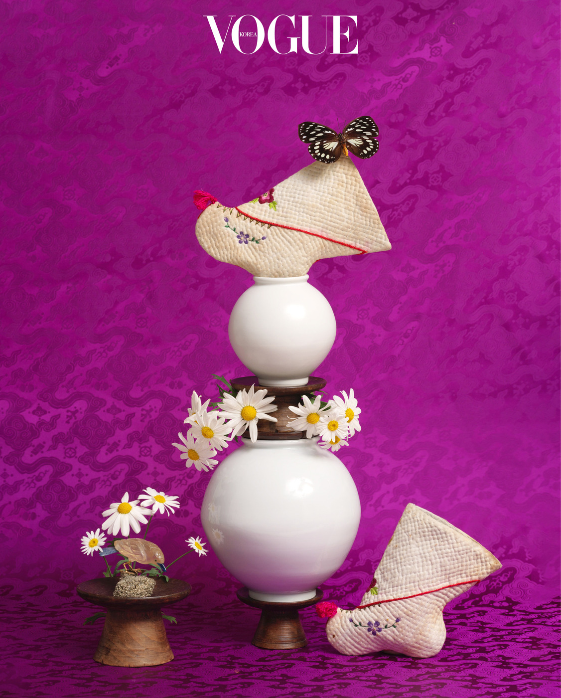 서영희 2002년에 처음으로 한국적인 정물화 사진을 찍었어요. 그때를 기점으로 뭔가를 한국적으로 표현하는 것이 저의 DNA와 맞닿아 있다고 느꼈죠. 그 후 30년 동안 잡지 작업을 하면서 패션 화보만큼 오브제 화보도 자주 작업했는데 저에겐 늘 그런 고민이 있었습니다. ‘이건 좀 지나치게 한국적이지 않나?’ ‘너무 촌스럽지 않나?’ 또는 ‘<보그>다운가?’ 같은 고민이었어요. 그러다 시대가 바뀌었죠. K-컬처가 부흥하고, 한국적인 것에 높은 점수를 매기는 분위기에서 더는 ‘한국적인 것이 무엇인가’라는 질문이 부담으로 느껴지지 않더라고요. 이렇게도, 저렇게도 다 잘 어우러졌죠. 이번 화보에서 프랑스의 전통적인 결혼 기념품 ‘글로브 드 마리에(Globe de Mariée)’ 같은 것을 소품으로 활용한 경우에도 정창기 선생님의 감각을 믿고, 이 또한 한국의 멋이라는 자신감으로 작업했습니다. 그러다 보니 아주 편안한 마음이 들더라고요. 우리 것을 글로벌하게 보여줄 수 있는 시점에 활약할 수 있어 행복합니다.
