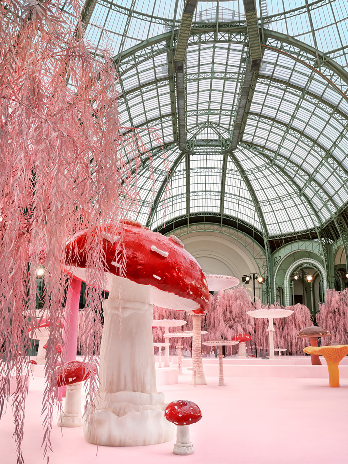 지난 10월 펼쳐진 샤넬 2026 봄/여름 쇼에서 아와르 오디앙이 장식한 피날레 못지않게 크게 이슈가 된 것이 바로 세트 디자인이었습니다. 은하수가 연상되는 검은 바닥과 거대한 행성 모형은 마티유 블라지라는 새로운 시대가 샤넬에 도래했음을 선포하는 듯했죠. 어젯밤 꾸뛰르 쇼가 열린 그랑 팔레에선 동화 <이상한 나라의 앨리스>의 한 장면이 떠올랐습니다. 쇼장이 거대한 버섯으로 가득했기 때문이죠. 그뿐인가요? 쇼 초대장은 버섯 모양 펜던트였고, 쇼에는 버섯 모양 굽이 반복적으로 등장했습니다. 마티유 블라지는 자신의 생애 첫 꾸뛰르 쇼장을 왜 ‘버섯밭’으로 만들었을까요?