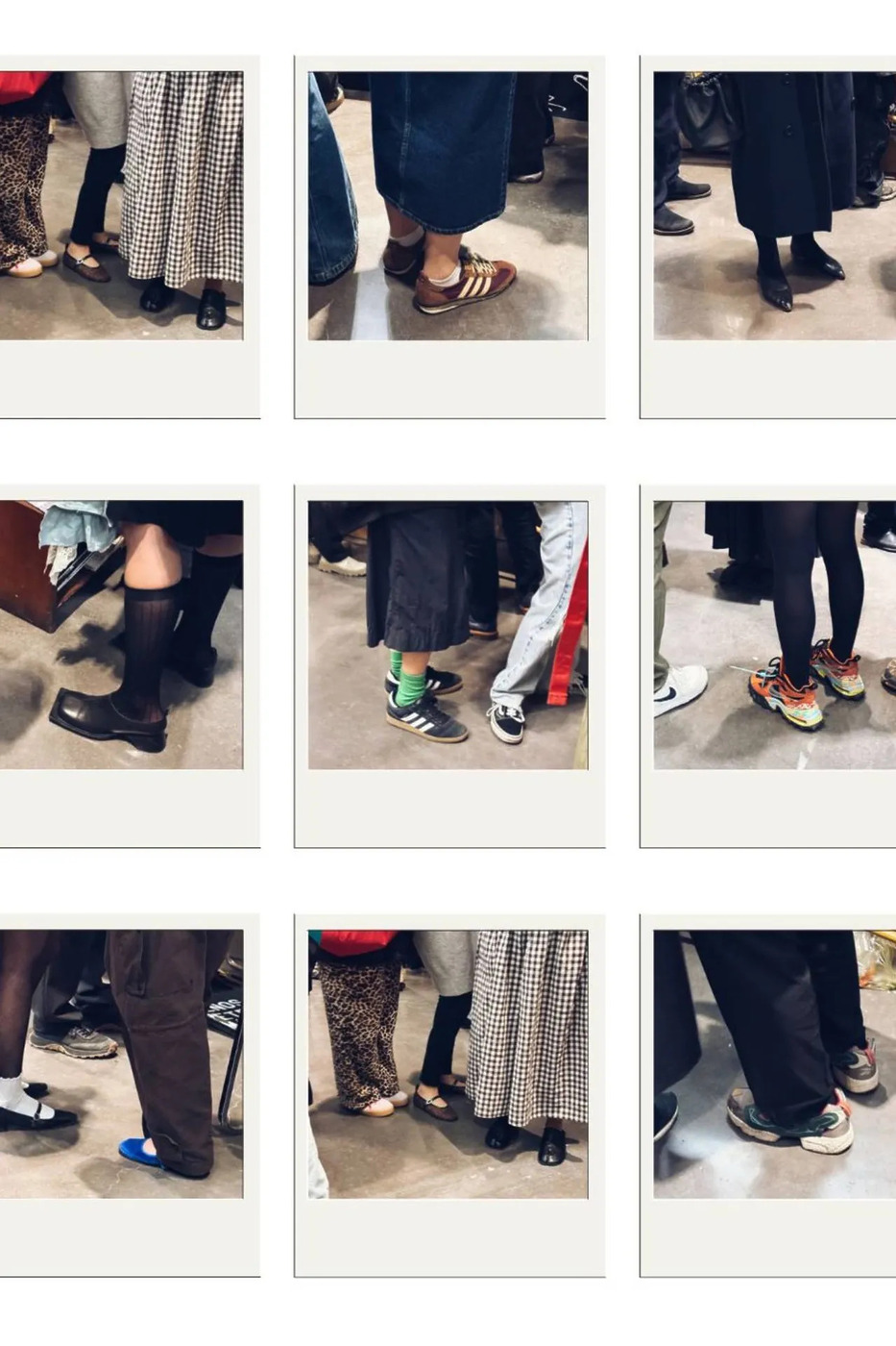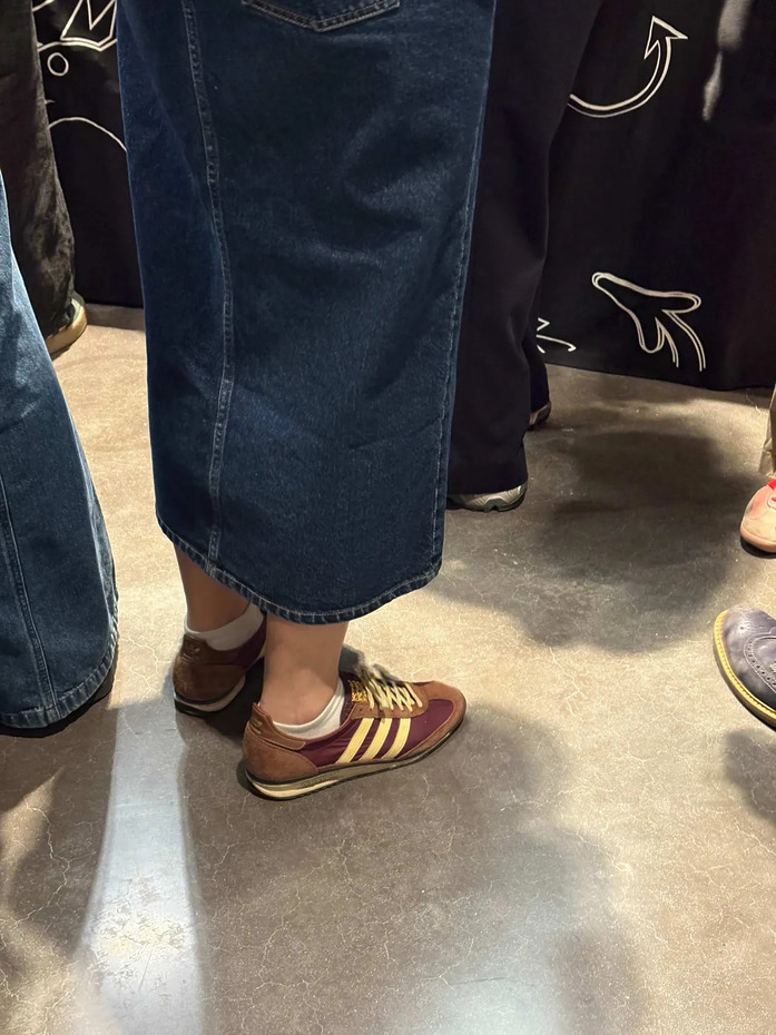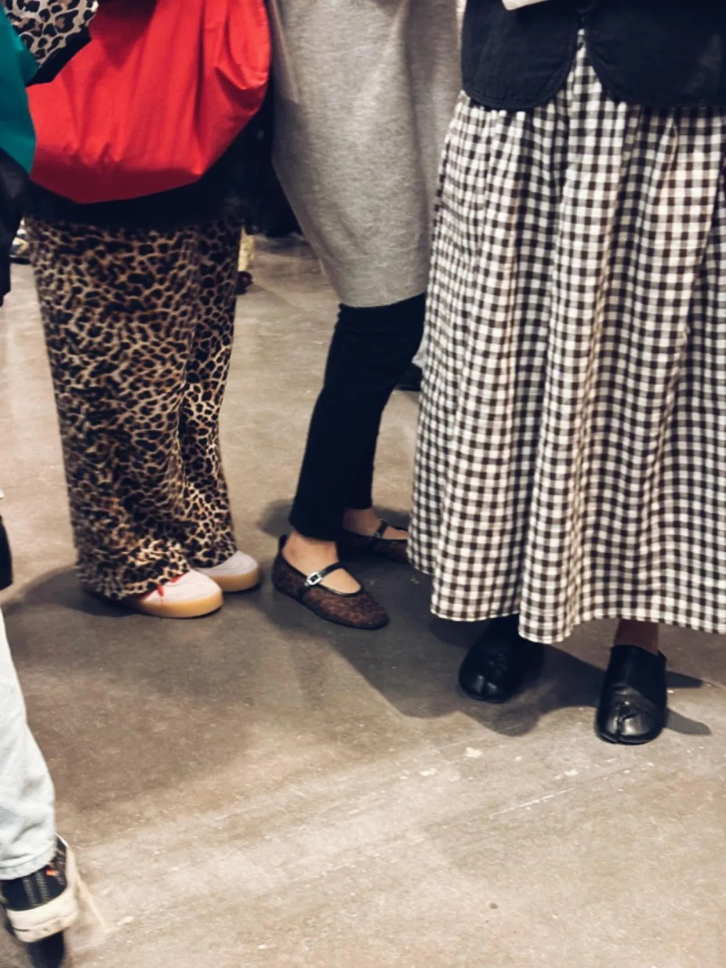 타비 플랫과 레오파드 플랫 슈즈가 한 프레임에 들어온 장면도 인상적이었습니다. 메종 마르지엘라의 타비 슈즈는 크리에이티브 업계에 있다면 한 번쯤 거쳐가는 디자인이지요. 여기에 애니멀 프린트 플랫과 기본 스니커즈가 섞이니 스타일의 결이 자연스럽게 드러났습니다. 포인트 슈즈 하나만 신어도 친구들 사이에서 스타일 역할 분담이 되는 셈입니다.