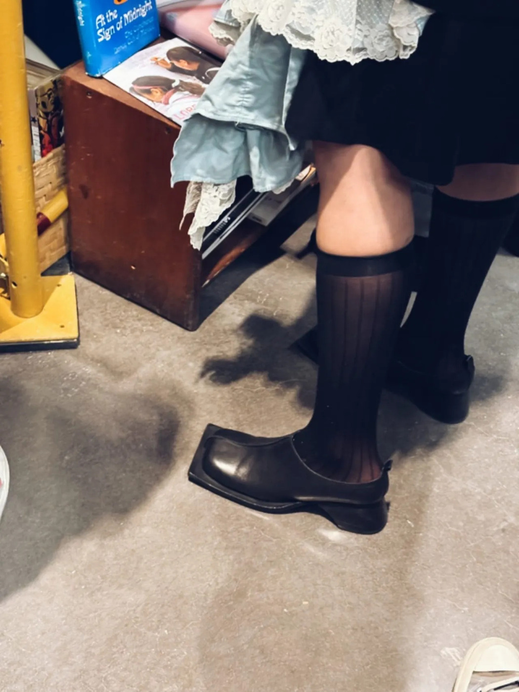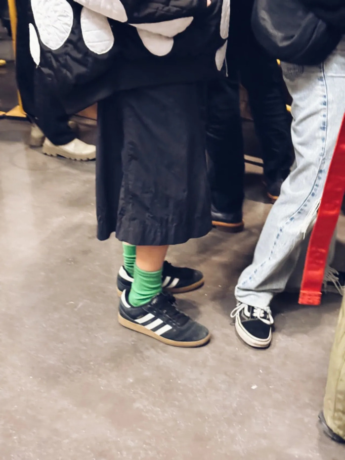 의외로 가장 많이 보인 건 이른바 ‘할머니 신발’로 불리는 플랫 슈즈입니다. 앞코를 뾰족하게 해 포인트를 줬습니다. 거리에서 만난 이는 네이비 코트, 블랙 타이츠에 조합했더군요. 덕분에 단정하면서도 힘을 뺀 인상을 줍니다. 장시간 걷는 날에는 굽보다 앞코 라인이 스타일을 좌우합니다. 뾰족한 앞코는 비교적 발이 빨리 피로해지니, 발볼이 넓다면 소재를 부드러운 가죽으로 골라보세요.