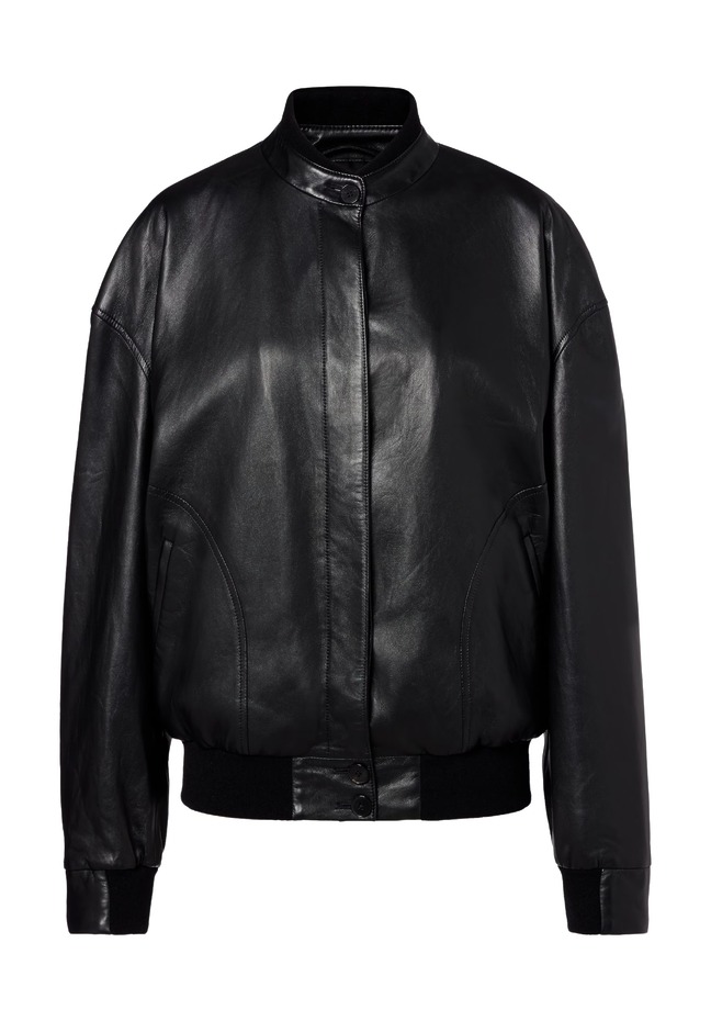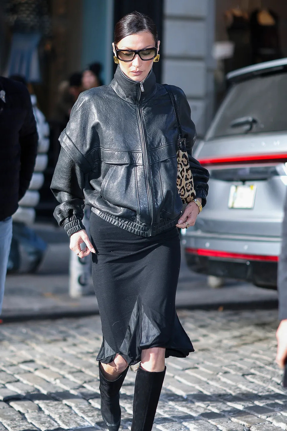 딱 하나, 오래 입을 외투를 장만한다면 레더 재킷을 추천합니다. 그중에서도 레더의 매력을 제일 잘 살려주는 봄버 스타일을 요즘 셀럽들이 즐겨 착용하더군요. 벨라 하디드는 올백 머리에 큰 이어링, 레오파드 백, 미디스커트에 부츠 조합으로 포멀한 멋을 냈습니다. 여기에 루스 핏의 레더 봄버 재킷을 입으니 슬림한 실루엣의 미디스커트와 반전 매력을 이루었죠. 재킷의 볼륨이 상체에 무게를 실어주면서 전체 비율이 안정돼 보이고, 레더 특유의 광택이 룩을 풍성하게 만들어줍니다.