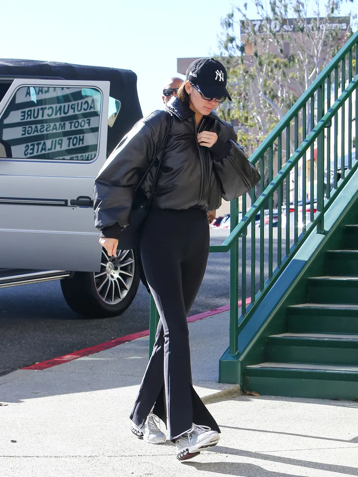켄달 제너는 볼캡에 부츠컷 레깅스, 스니커즈처럼 편한 옷차림에도 레더 봄버 재킷을 매치했습니다. 만약 켄달 제너가 면 소재의 봄버 재킷이나 패딩을 입었다면 지나치게 캐주얼해 보였을 거예요. 소재를 레더로 선택해 옷차림에 긴장감을 더한 거죠. 헤일리 비버도 무지 티셔츠에 쇼츠라는 아주 가벼운 조합에 루스 핏 레더 봄버 재킷을 걸쳐 단정한 인상을 완성했습니다. 그리고 레더 재킷의 포멀함을 힐 샌들로 받아주며, 집 앞 차림새를 저녁 약속 룩으로 끌어올렸죠.