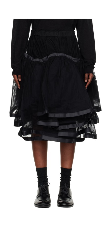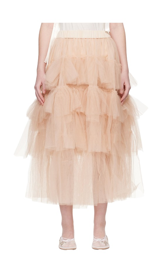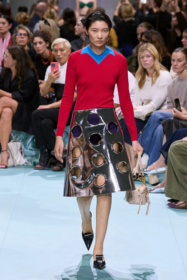 지금 패션의 재미를 담당하는 아이템이 하나 있습니다. 옷걸이에 걸려 있는 모습만 봐도 웃음이 새어 나오는, 이른바 ‘제정신이 아닌’ 스커트입니다. 이런 치마를 선보이고 있는 대표적인 디자이너가 프라다인데요. 2025 봄/여름 컬렉션에는 구멍이 송송 뚫려 있어 치즈를 연상시키는 스커트가 등장했습니다. 현실성이라고는 1도 없는 것처럼 보이는 디자인이지만, 신경 써서 스타일링한다면 일상에서도 충분히 입을 수 있습니다. 밀라노 패션 위크에 참석한 위 게스트처럼, 무난한 디자인의 톱을 활용하는 거죠. 몇 년 전 유행했던 ‘미니멀한 상의와 화려한 스커트’ 조합이 떠오릅니다. 다양한 컬러와 소재를 섞는 걸로 모자라 밑단에 러플 장식까지 더한 2026 봄/여름 컬렉션 피스 역시 같은 방식으로 활용할 수 있겠군요.