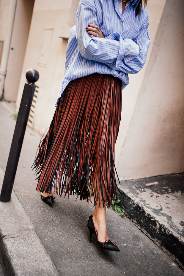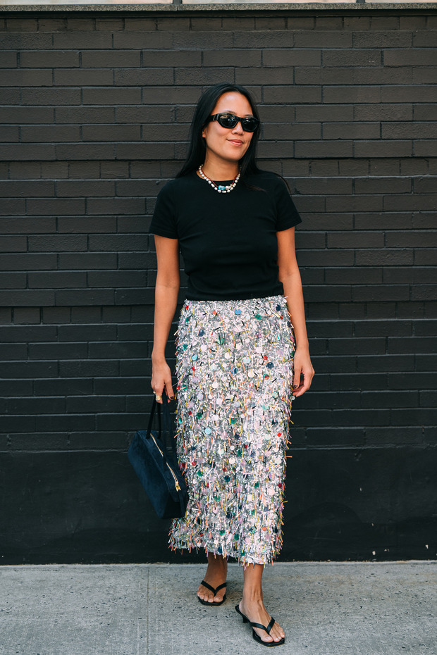 런웨이뿐만이 아닙니다. 패션 위크만 되면 ‘저걸 도대체 어떻게 입지?’ 싶은 치마를 입은 채 아무렇지도 않게 거리를 활보하는 사람을 쉽게 발견할 수 있죠. 물론 철저하게 계산된 스타일링과 함께입니다. 무지 후디와 클래식한 네이비 코트를 활용해 메탈릭 스커트의 존재감을 중화하거나, 갈기갈기 찢긴 듯한 프린지 스커트가 과해 보이지 않도록 멀끔한 스트라이프 셔츠라는 장치를 심어두는 식으로 말이죠. 여름에는 복잡하게 생각할 것 없이 티셔츠 한 장만 입으면 되겠군요.