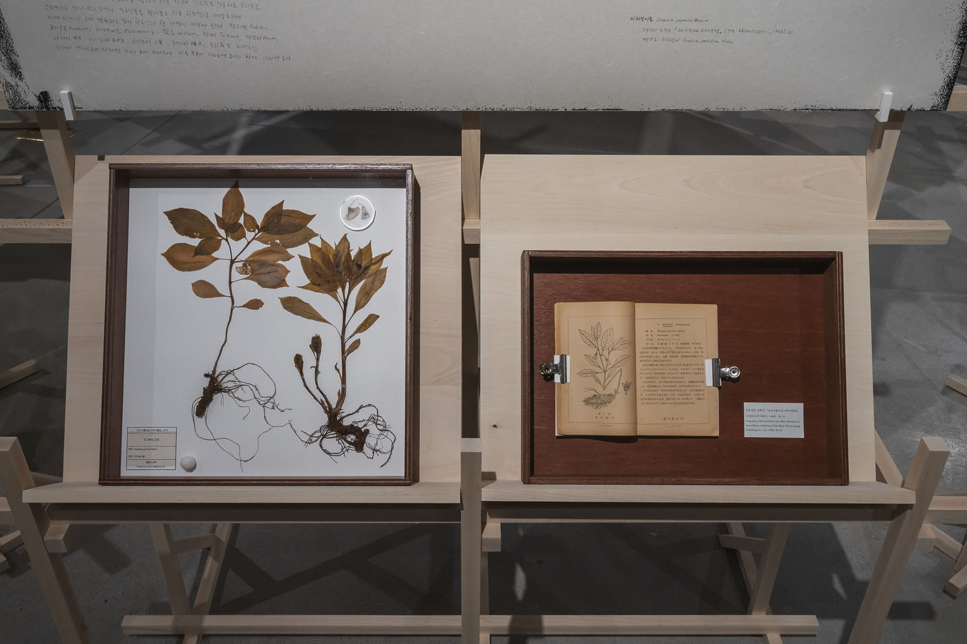 이소요, '『조선식물도설 유독식물편』, 주석’, 2021~현재, 디지털 프린트에 연필 드로잉, 식물 보존물, 참고 문헌, 가변 크기. 사진: 조준용, 서울시립미술관 제공
