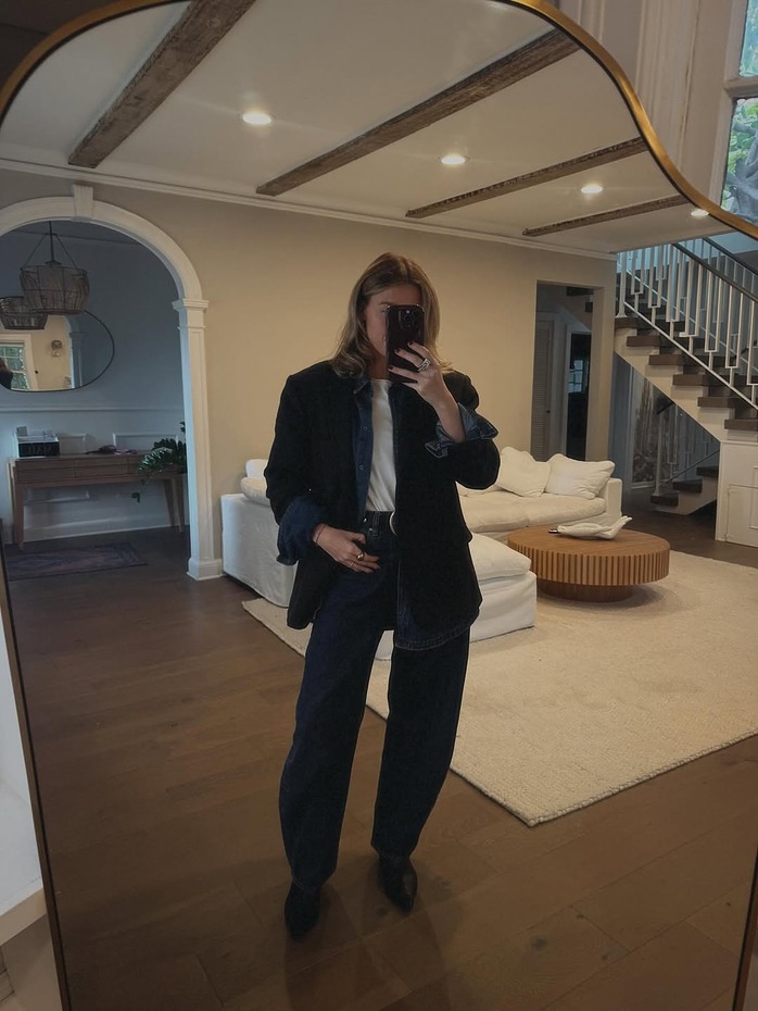 셀비지 청바지가 드레스업의 상징이라기보다, 출근 룩의 미니멈을 지키는 가장 쉬운 방법이라고 생각하면 좋습니다. 다림질이 필요 없을 정도로 빳빳한 소재니까요. 셀비지의 탄탄함이 실루엣을 잡아주기 때문에 상의를 비교적 가볍게 입어도 단정해 보이죠. 조금 더 포멀하게 입고 싶은 날에는 상의를 청바지 속에 넣어 입고 벨트를 더해 허리선을 정리해보세요. 신발은 살짝만 단단한 걸 선택하면 성공할 확률이 높아집니다. 둥글고 말랑한 운동화보다 형태가 또렷한 부츠나 로퍼를 추천합니다.
