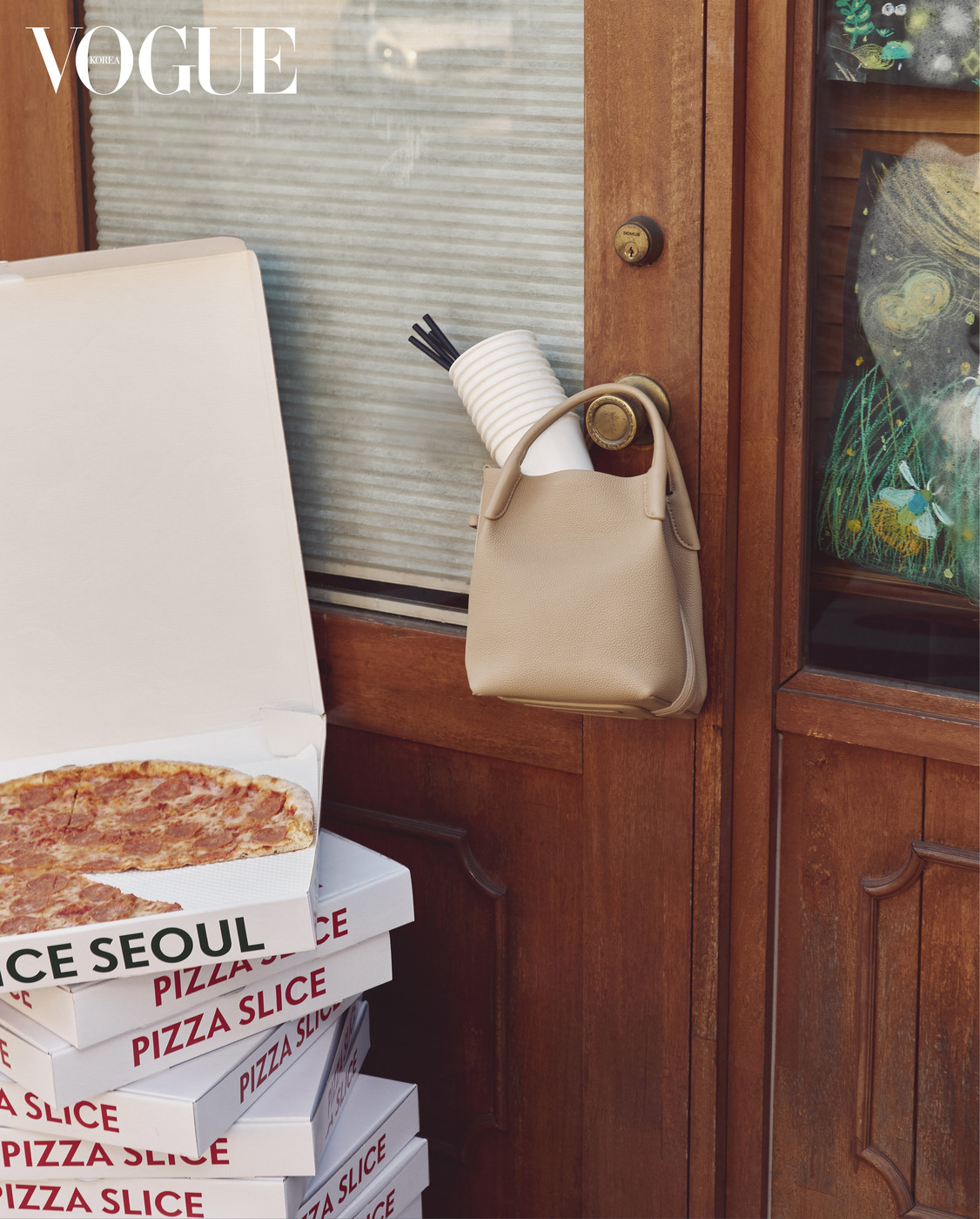 PIZZA SCHOOL 카프스킨으로 완성해 매끈한 감촉과 가벼운 무게를 자랑하는 ‘베일’ 백. 버킷 백 형태로 넉넉한 수납공간을 갖췄다.