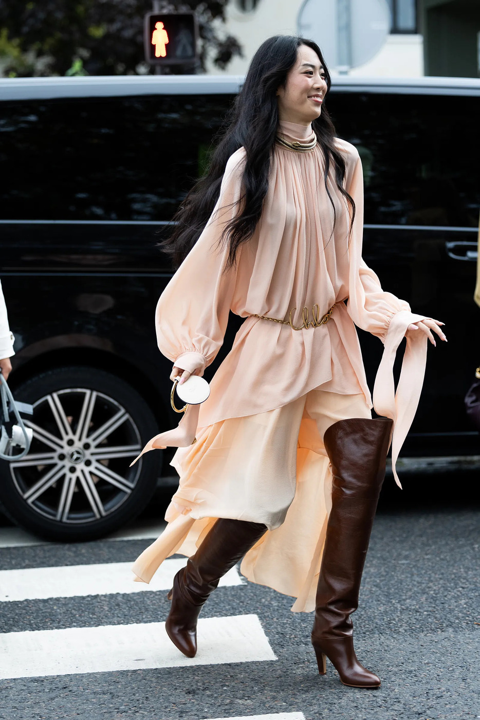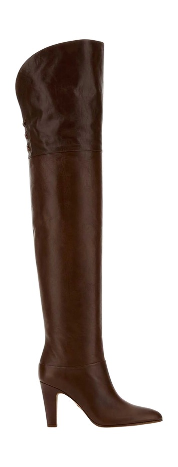지난해에 이어 과하다 싶을 정도로 허벅지를 덮는 XXL 부츠의 인기는 계속됩니다. 특히 굵직한 힐과 아몬드 모양 앞코를 갖춘 브라운 롱부츠는 봄여름까지 이어지죠. 특히 한없이 흩날리는 시어나 실크 소재의 프릴 맥시 드레스와 매치하면 2000년대식 보헤미안 시크 무드를 재현할 수 있어요. 끌로에가 추구하는 미학을 다시 꺼내기 좋은 타이밍이죠.