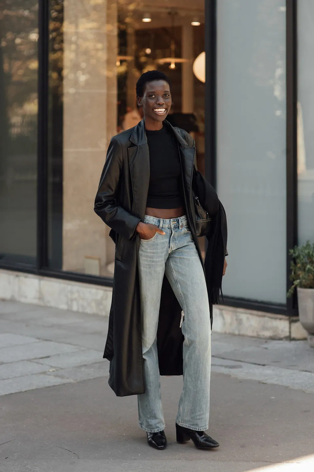 켄달 제너는 블랙 레더 앵클 부츠를 스키니 진과 조합해 존재감을 드러냈습니다. 반면 2026년 거리 위 멋쟁이는 레더 코트와 매치하되, 스트레이트 진 아래로 숨겼죠. 롱 코트와 청바지라는 익숙한 조합에, 레더 소재로 포인트를 준 겁니다. 이것만으로도 부츠가 할 일을 다 하기 때문에 특별한 장식이 필요 없죠.