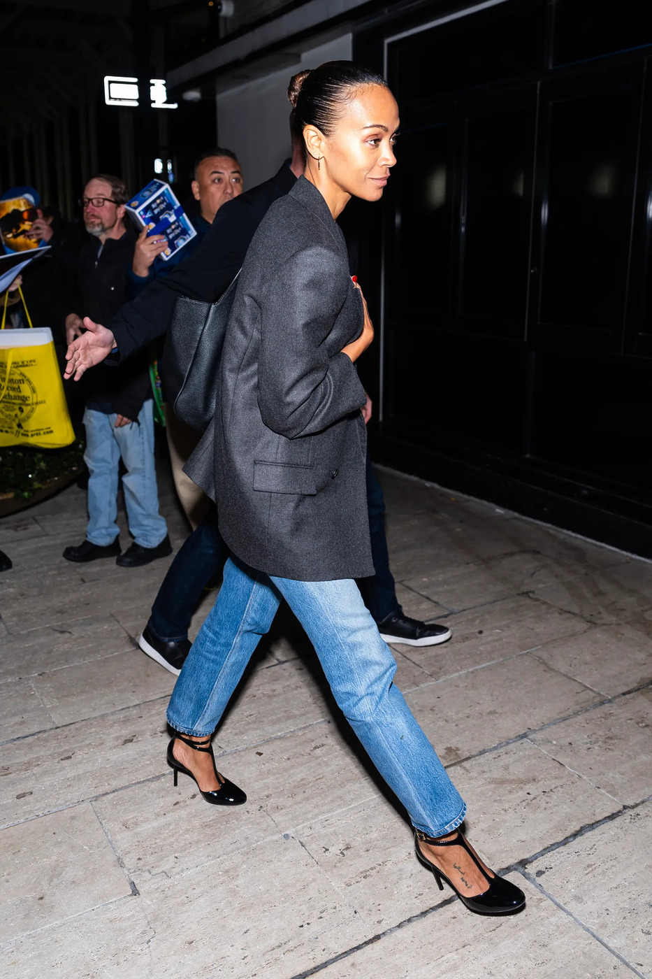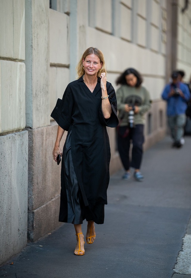페라가모의 T 스트랩 슈즈는 더 아찔한 모습입니다. 뾰족한 앞코 때문이었죠. 발등이 다소 허전해 보인다는 것을 고려해 액세서리를 더한 센스도 눈에 띄는군요. 옷차림이 가벼워지는 봄과 여름에 참고할 만한 스타일링이었습니다.