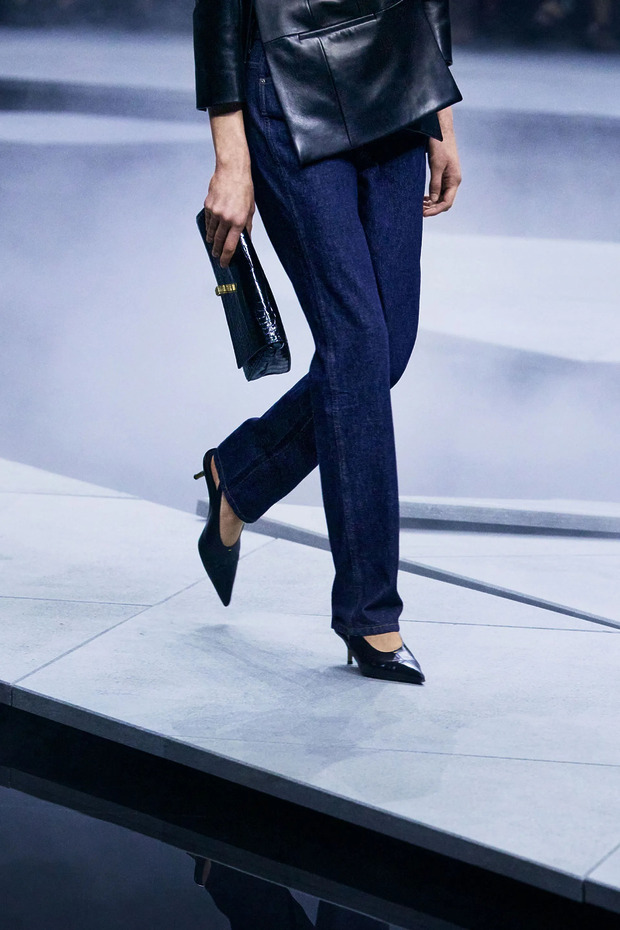 이미 스트레이트 핏 데님을 여러 벌 갖고 있다면, 크롭트 데님을 눈여겨봐야 합니다. 신발 윗부분을 덮는 긴바지가 몇 년 동안 유행해서인지, 그와 완벽한 대척점에 있는 크롭트 데님이 매력적으로 느껴지기 시작했거든요. 이런 흐름을 가장 먼저 감지한 브랜드가 바로 셀린느입니다. 멀쑥한 블레이저 룩을 연출할 때마다 크롭트 데님을 활용했죠. 핵심은 역시 복숭아뼈 근처의 ‘비는 공간’입니다. 더 깔끔한 분위기를 원한다면 셀린느처럼 단순하게 비워두는 것은 물론, 컬러 양말로 포인트를 더하는 것도 가능하죠.