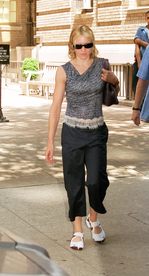먼저 플랫 슈즈와의 조합입니다. 2000년대 뉴욕의 마돈나처럼 발꿈치가 드러나는 플랫이나 발레리나 슈즈를 매치하면 Y2K로 흐르기 쉽지만, 상의를 미니멀하게 눌러주면 이야기가 달라집니다. 몸에 붙는 탱크 톱이나 블랙 재킷을 더하면 시크하게 마무리되죠.