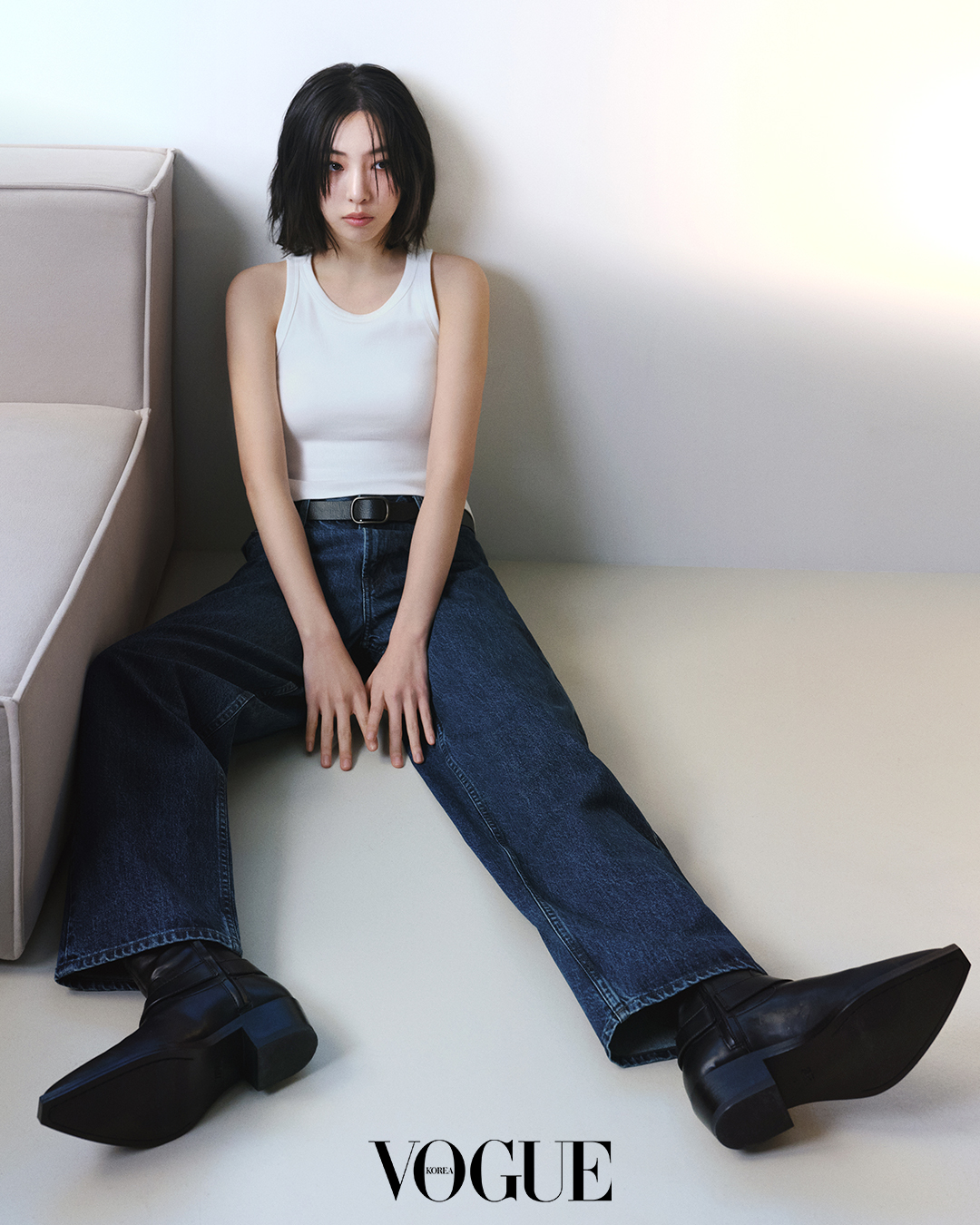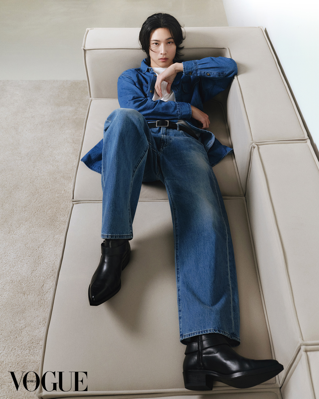 에어리즘 크루넥 T, 데님 셔츠, 배기 진, 벨트 모두 유니클로.