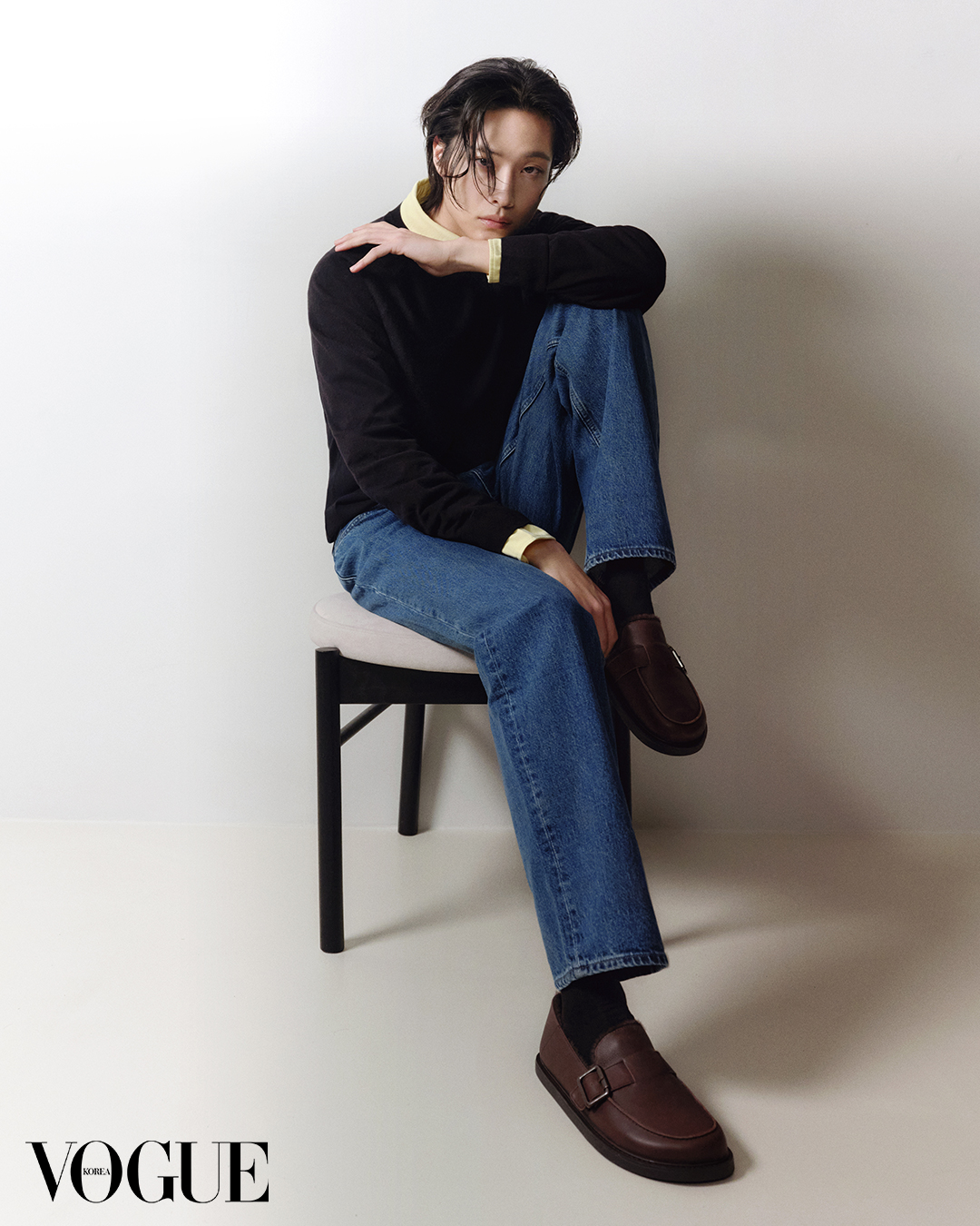 옥스퍼드 오버사이즈 셔츠, 니트 크루넥 스웨터, JWA 스트레이트 진은 유니클로.