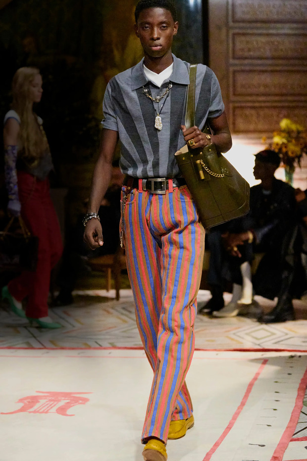 다리오 비탈레의 처음이자 마지막 베르사체 컬렉션에서는 스타일링이 돋보였습니다. 미국을 상징하는 아이템인 폴로 티셔츠에 수트 베스트를 매치하니 1980년대 밀라노 거리를 누비는 멋쟁이 신사가 떠오르는 룩이 완성됐습니다. 흔히 볼 수 있는 가로줄 무늬가 아니라 세로줄 무늬가 더해진 폴로 티셔츠 역시 흥미롭긴 마찬가지였고요.
