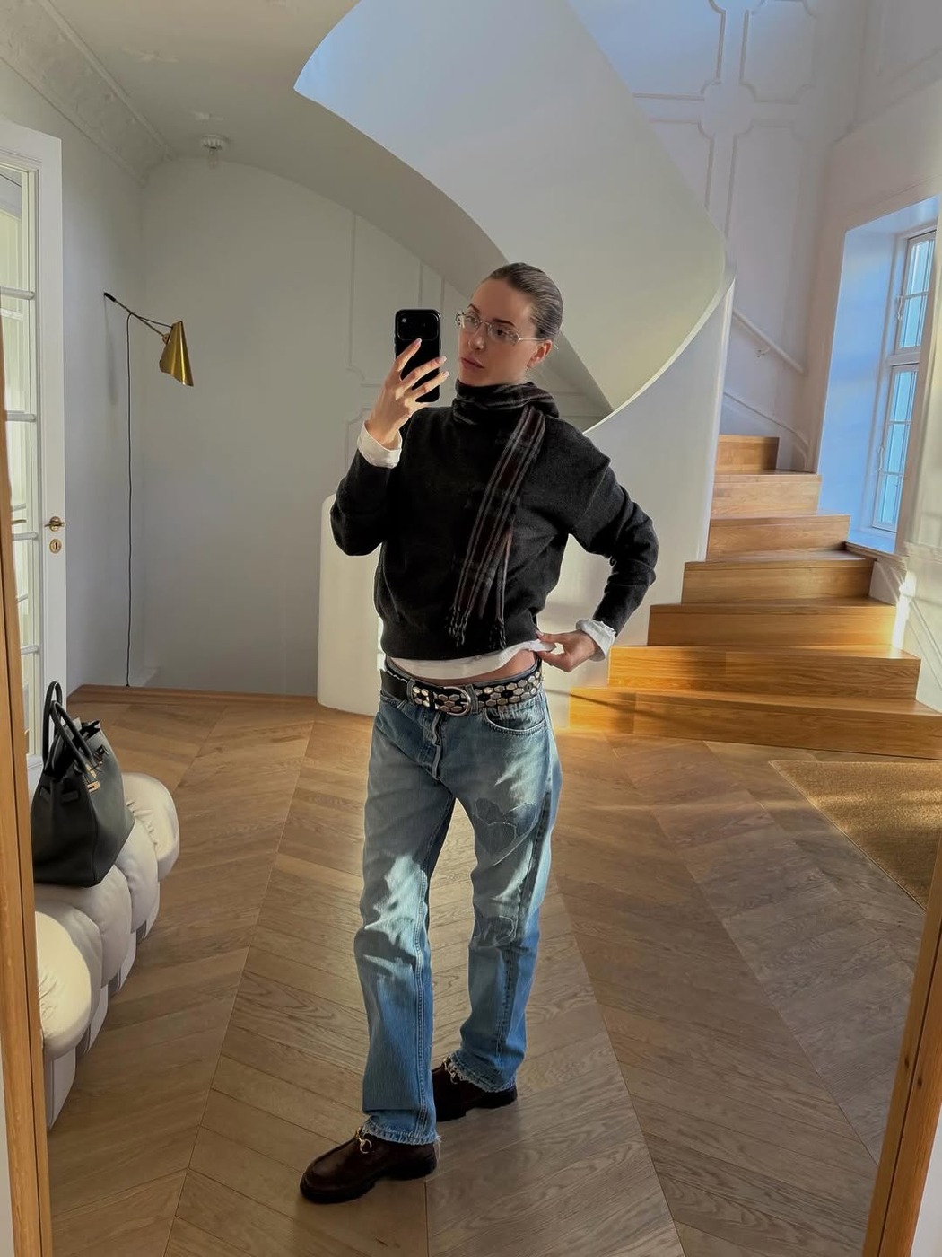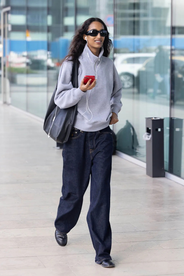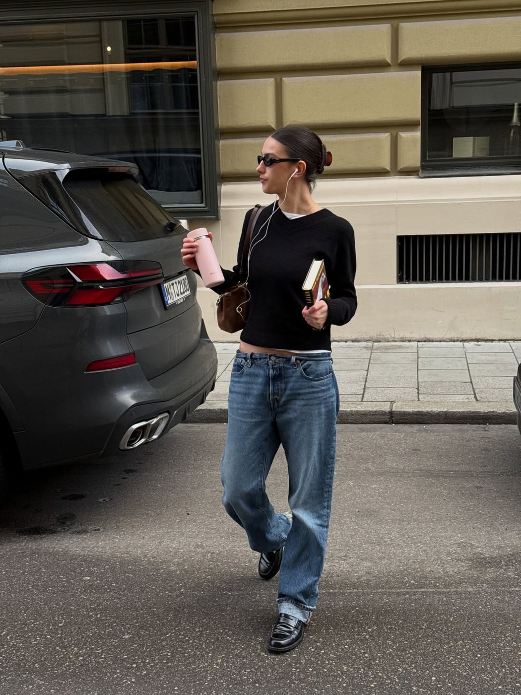 살짝 낮은 허리선, 스트레이트로 떨어지는 바지폭, 바닥에 느슨하게 닿는 밑단이 핵심입니다. 배기 진처럼 여유롭지만, 무작정 넓지 않은 통이 포인트죠. 이 미묘한 차이 덕분에 다리는 길어 보이고 전체 실루엣은 단정해집니다. 여기에 상의는 최대한 깔끔하게 정리하고 펌프스나 로퍼처럼 포멀한 신발을 신으면 청바지인데도 제대로 차려입은 느낌이 나죠.
