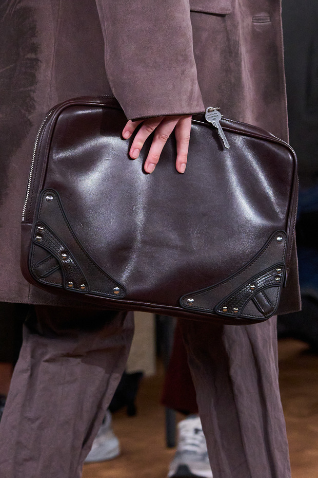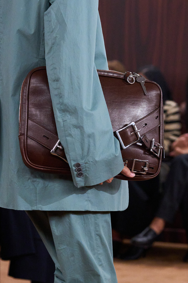 여차하면 휘둘러서 무기처럼 쓸 수 있을 만큼 각진 모서리 때문일까요? ‘의사 가방’은 어딘가 남성적인 분위기를 뿜어냅니다. 수트와의 궁합이 더할 나위 없이 좋다는 뜻이죠. 아크네 스튜디오는 수트의 소재와 색깔을 변주했습니다. 스터드와 벨트 장식을 활용해 자칫 심심해 보일 수 있는 룩에 재미를 불어넣는 것도 잊지 않았고요. 매스큘린한 의사 가방에 각종 배지나 참 장식을 단다면, 그 자체로 ‘패러독스 드레싱’을 완성하는 것도 가능합니다.