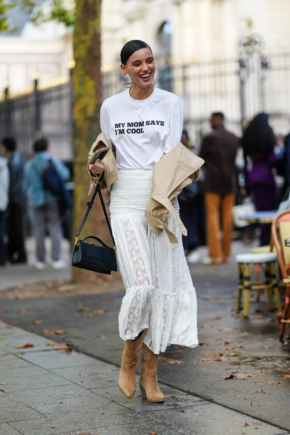 늘 헐렁한 바지에 삐딱한 볼캡과 매치하던 그래픽 티셔츠를 입어보세요. 문장은 건방질수록 좋습니다. 레이스 롱스커트의 포멀함이 단번에 중화되죠. 무작정 옆으로 퍼지는 A라인 스커트보다, 직선으로 뚝 떨어지다가 끝에서 살짝 퍼지는 머메이드 스커트를 택해보세요. 꽃무늬 레이스나 러플을 더해도 티셔츠에서부터 깔끔하게 내려온 라인이 드레시함을 덜어줄 거예요. 여기에 카우보이 부츠로 투박함을 가미하면 완성이죠!