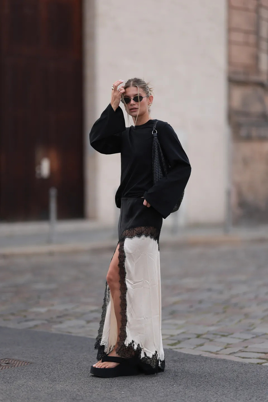 이번엔 컬러로 시크함을 불어넣는 겁니다. 블랙 티셔츠를 입고, 블랙 레이스 디테일 스커트로 차분하게 접근해보세요. 스커트에 슬릿까지 있다면 레이스의 섹시한 면을 강조할 수 있죠. 나머지 아이템도 패턴 없는 블랙으로 맞춰보세요. 레이스 스커트를 입었다는 인상보다 포인트를 잘 줬다는 생각이 먼저 들죠.