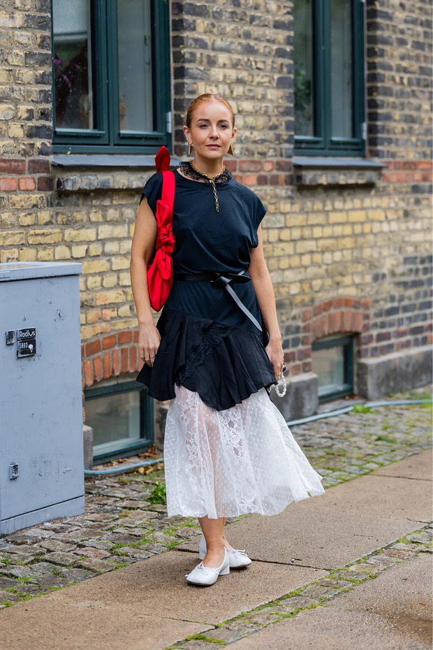 롱 티셔츠에 벨트를 더하는 방식도 있습니다. 허리선을 확실히 잡아주면 드레이핑과 주름이 강조되며 레이스의 질감이 더욱 도드라지죠. 레이어드 고수가 되는 건 순식간입니다. 굽이 살짝 있는 발레 플랫을 신으면 클래식과 트렌드가 자연스럽게 교차합니다.
