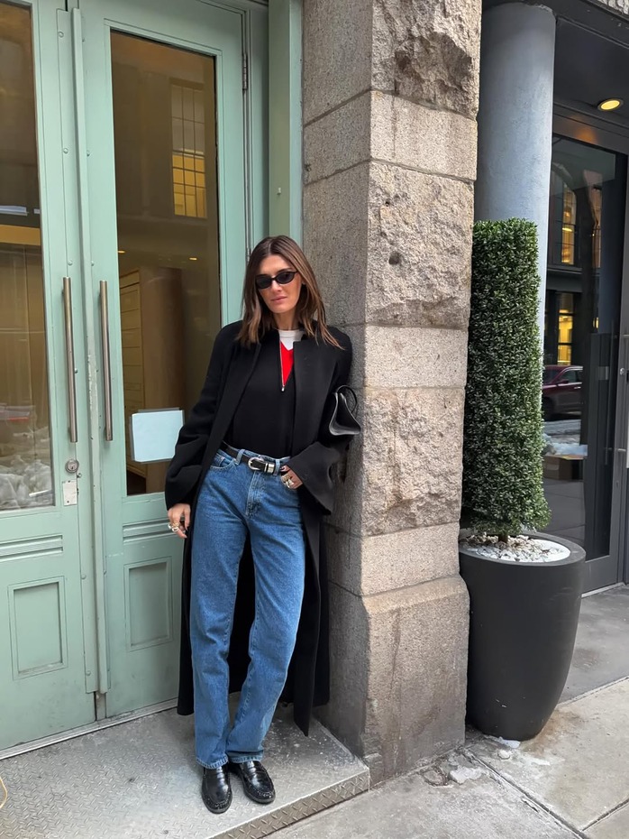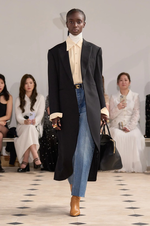 런웨이에서 이 조합은 더 노골적으로 드러납니다. 스트레이트부터 배기, 배럴 핏까지 청바지는 다양한 모습으로 등장하고, 블랙은 늘 그 위에 얇고 단단한 막처럼 자리하죠. 셀린느는 청바지에 블랙 블레이저 재킷과 블랙 코트의 변주를 선보이며 실루엣과 질감만으로 승부했어요. 발렌시아가, 케이트, 아레아 등에서도 블랙 아우터나 톱을 유연하게 매치하며 이 조합을 확신의 스타일링으로 이끌었고요.