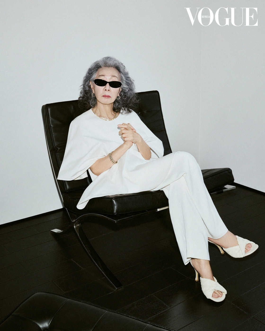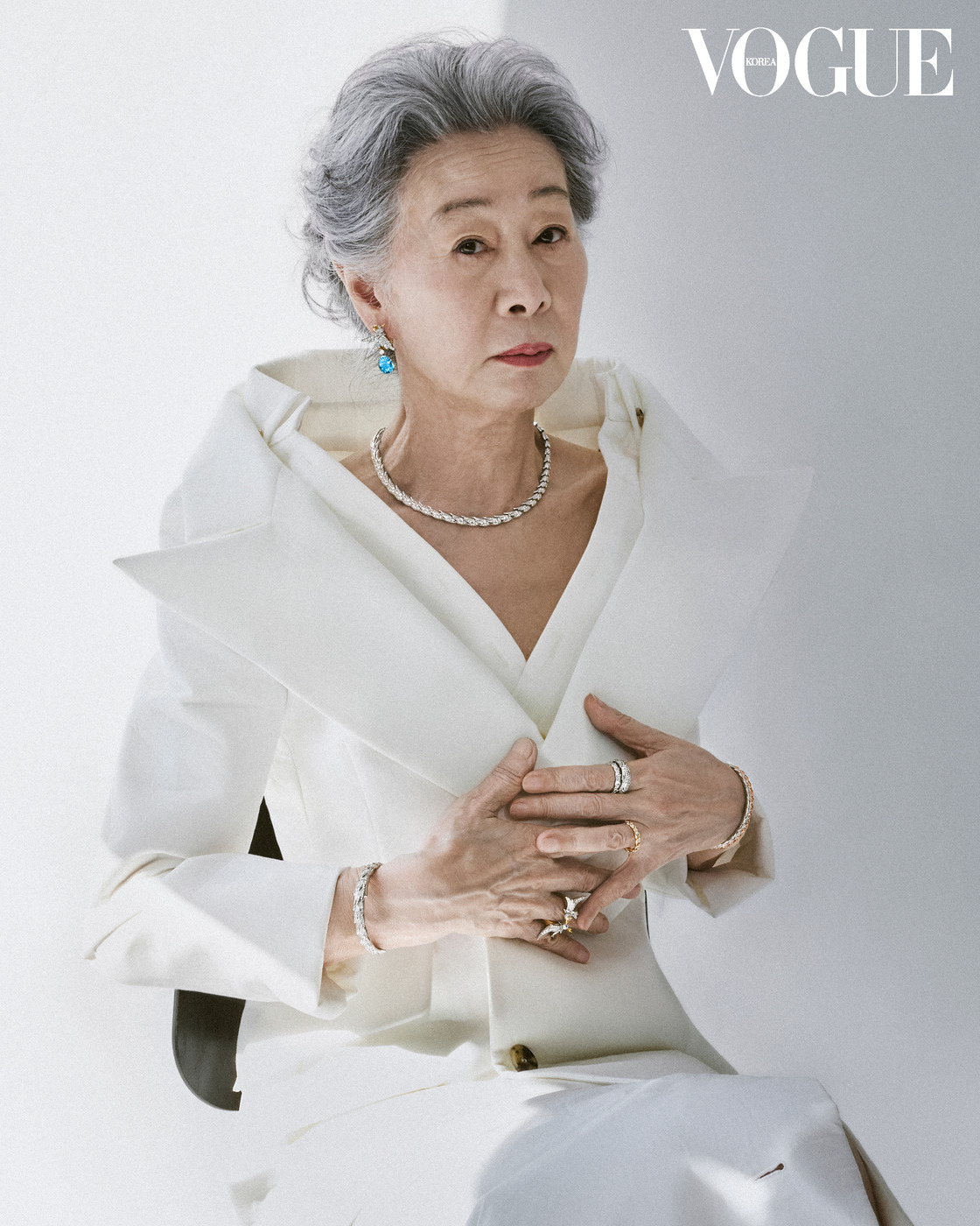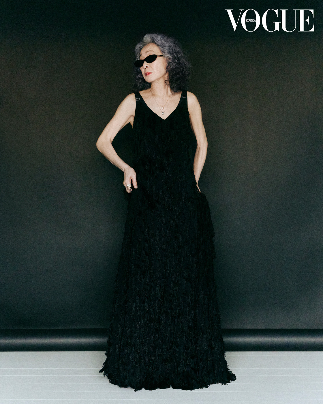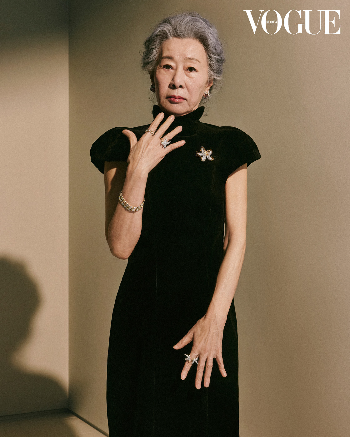 윤여정의 독보적인 카리스마는 어떤 배우도 대체할 수 없다. 겹쳐 착용한 목걸이와 반지는 ‘티파니 버드 온 어 락’ 컬렉션. 프린지 장식 드레스는 보테가 베네타(Bottega Veneta).