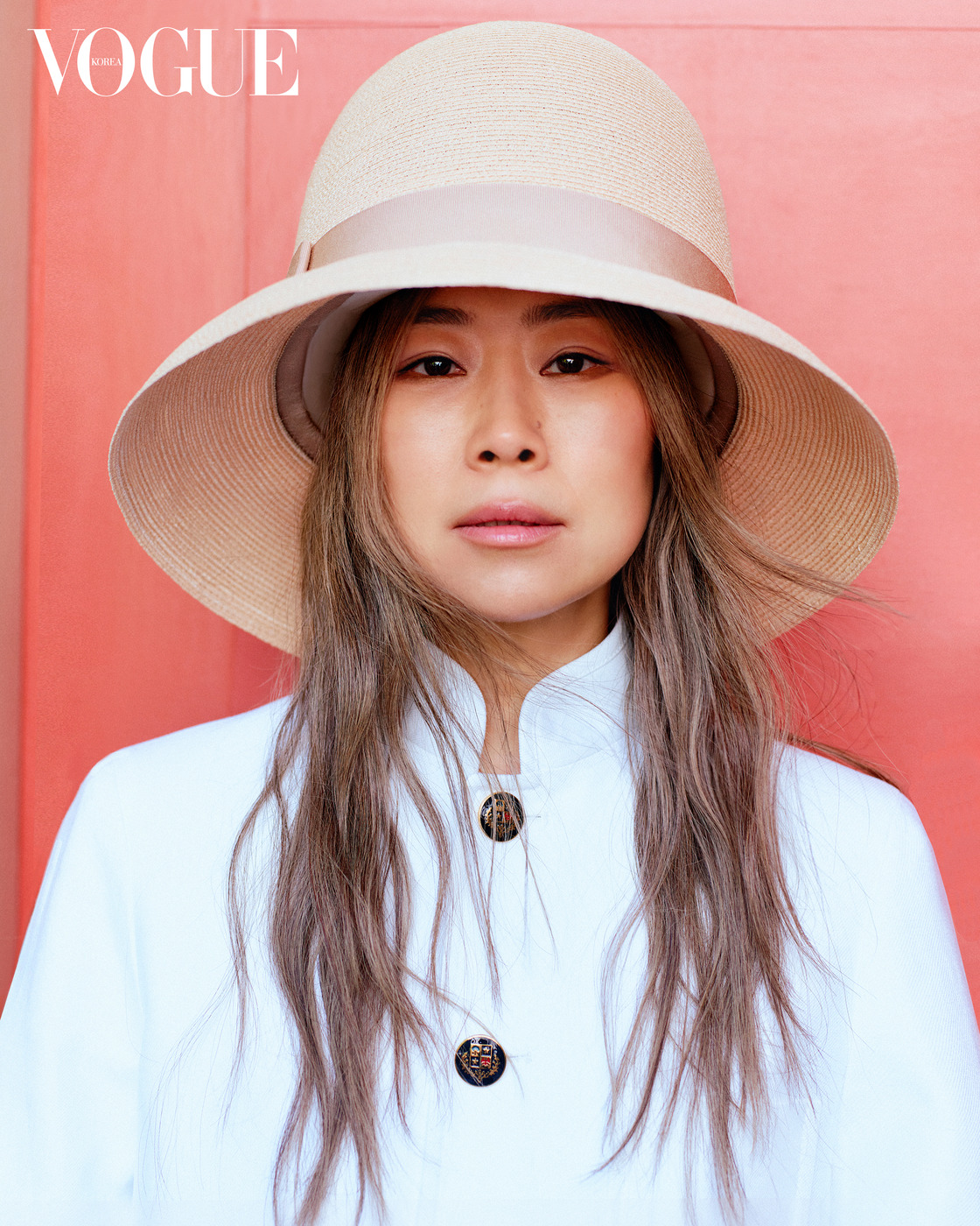 최고급 소재로 더 유명한 브랜드 로로피아나를 개성 있게 연출한 매기 강. 하이넥 칼라의 리넨 재킷에 독특한 밀짚모자를 스타일링했다.