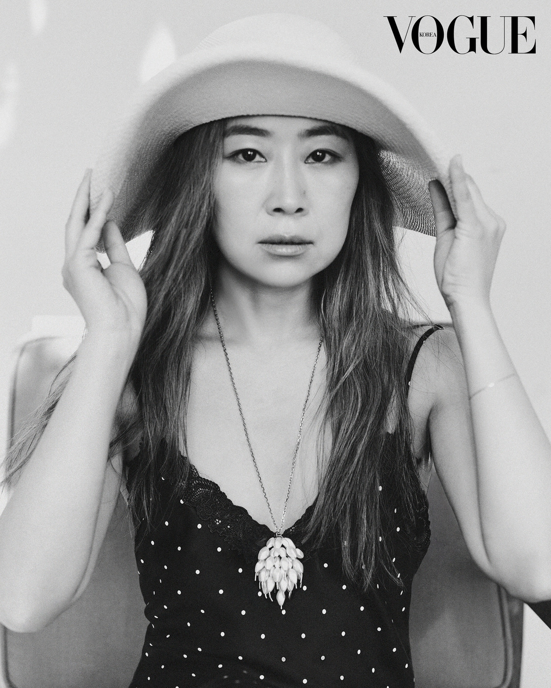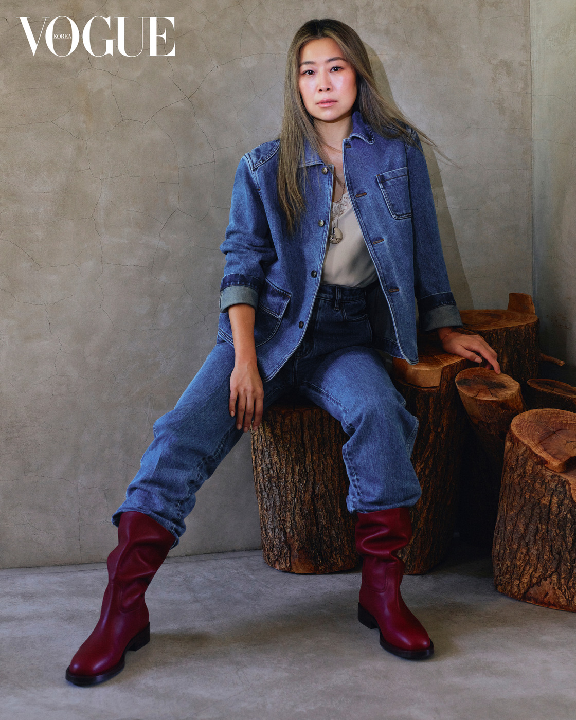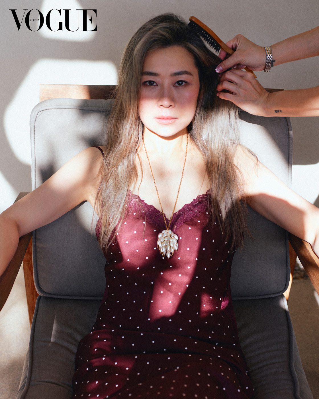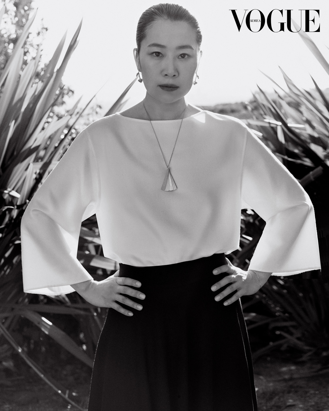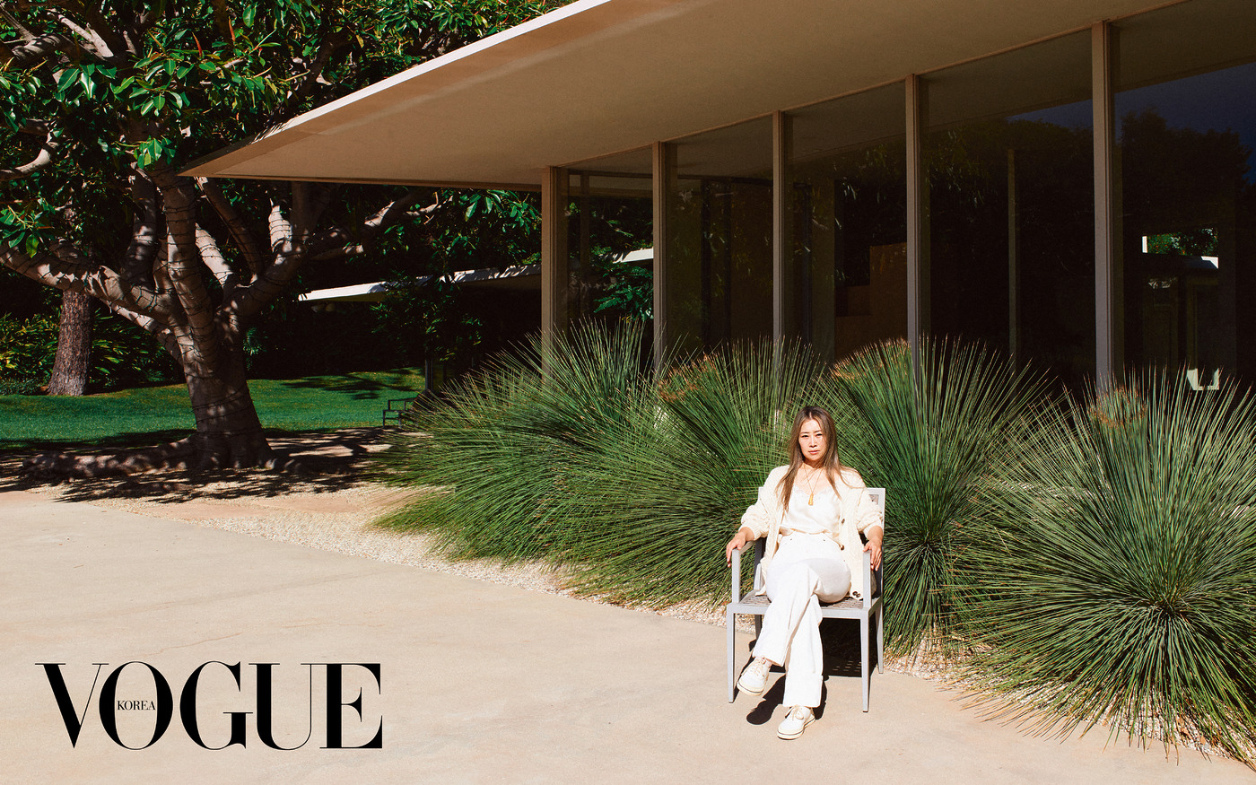 로스앤젤레스 베벌리힐스에서 만난 매기 강 감독. 화창한 날씨만큼 밝고 쾌활한 성격의 그녀는 유창한 한국어로 서울에서 온 <보그> 팀을 맞이했다. 로로피아나(Loro Piana)의 레이스 장식 실크 톱과 부드러운 캐시미어 카디건, 아이보리색 데님을 캐주얼하게 연출했다.