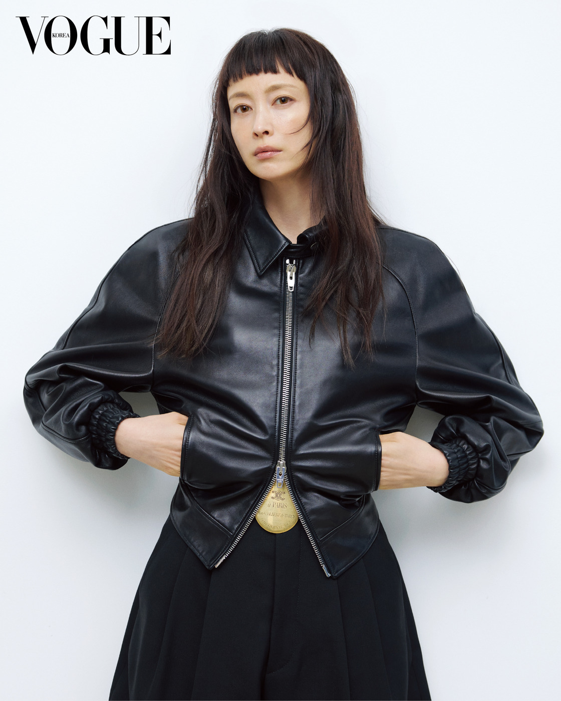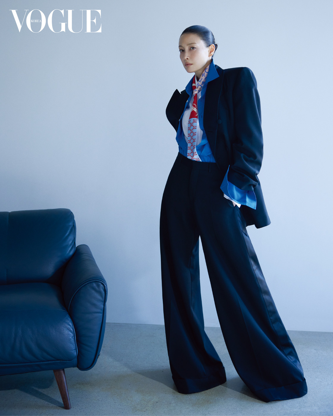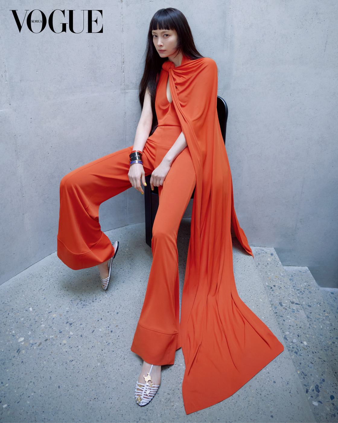 세련되고 쿨한 파리지엔 무드 속에서 강렬한 매력을 발산한 다홍색. 와이드 팬츠로 완성한 저지 소재 올인원 수트와 케이프는 멋스러움 그 자체. 배우의 독특한 매력과 잘 어울린다.