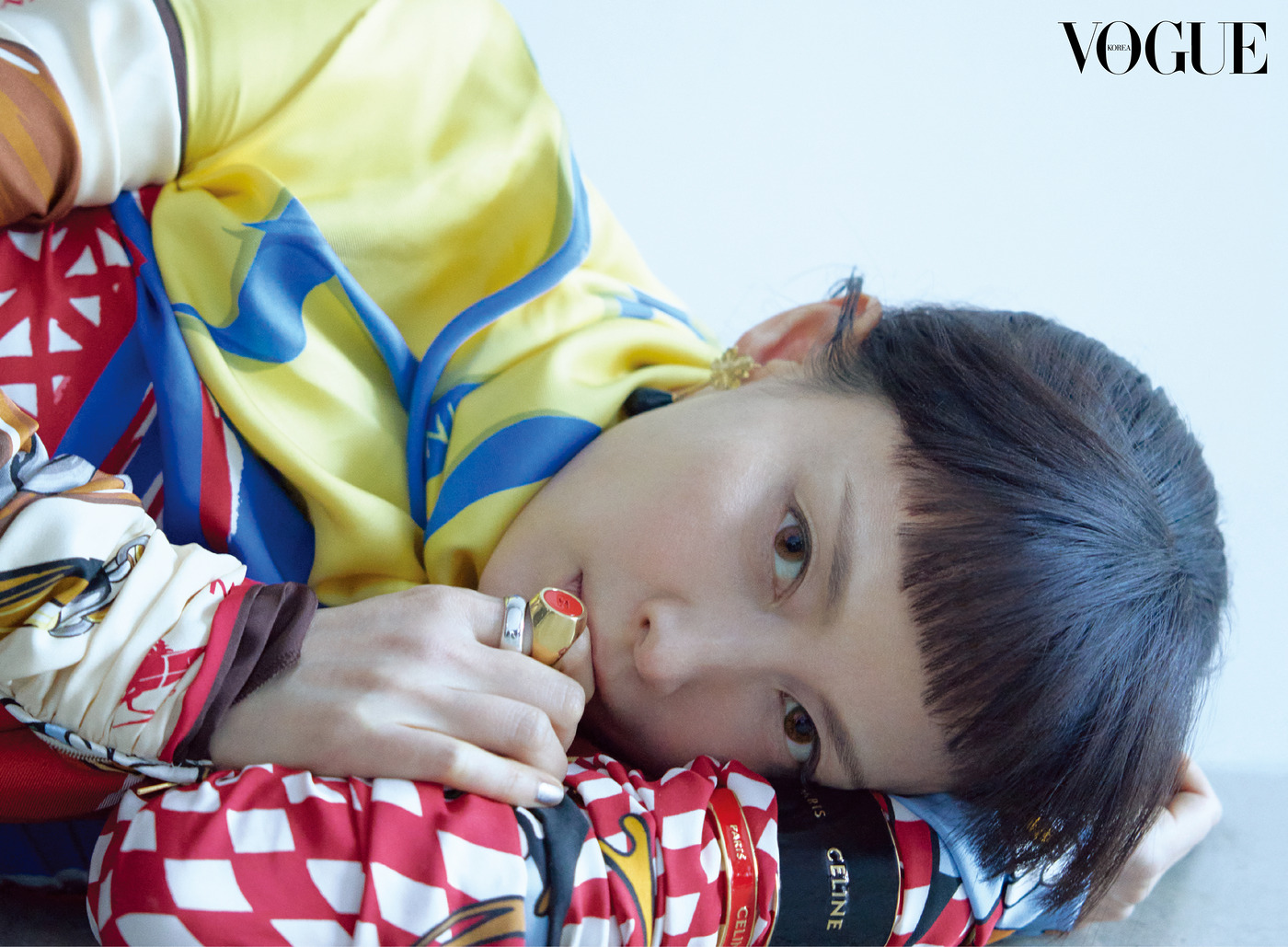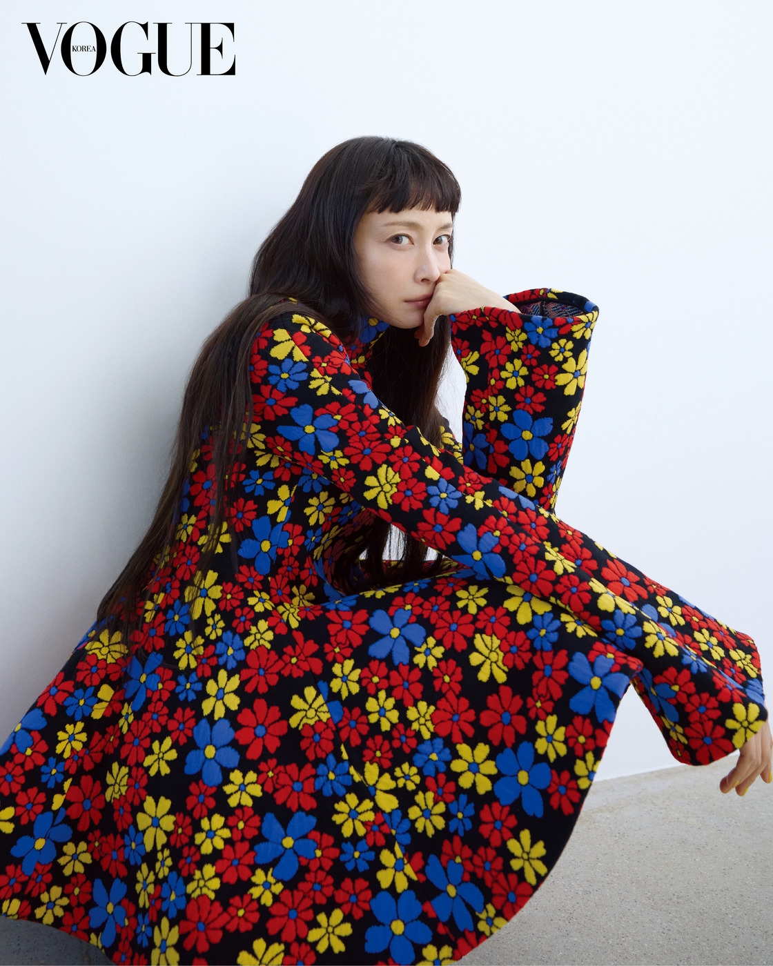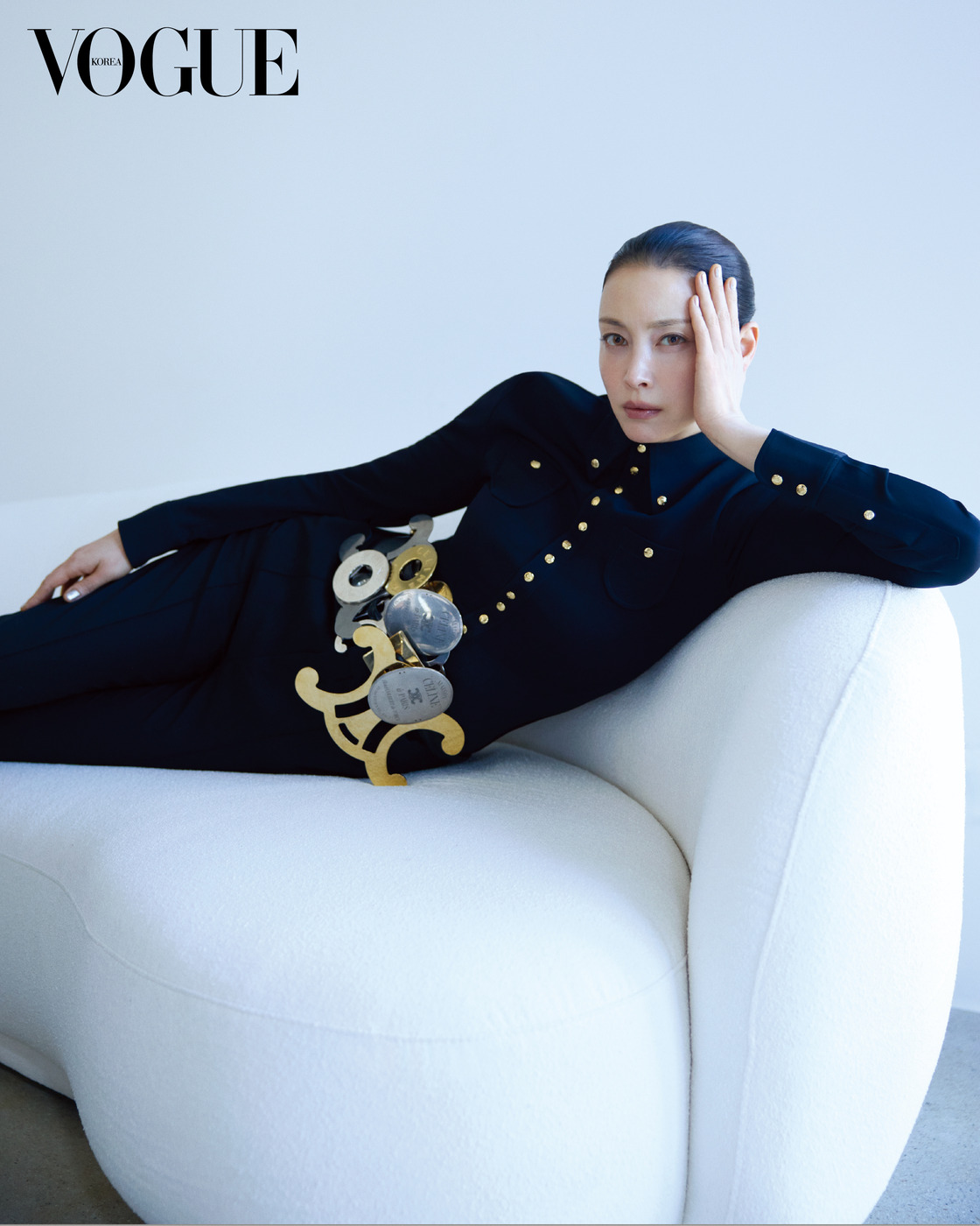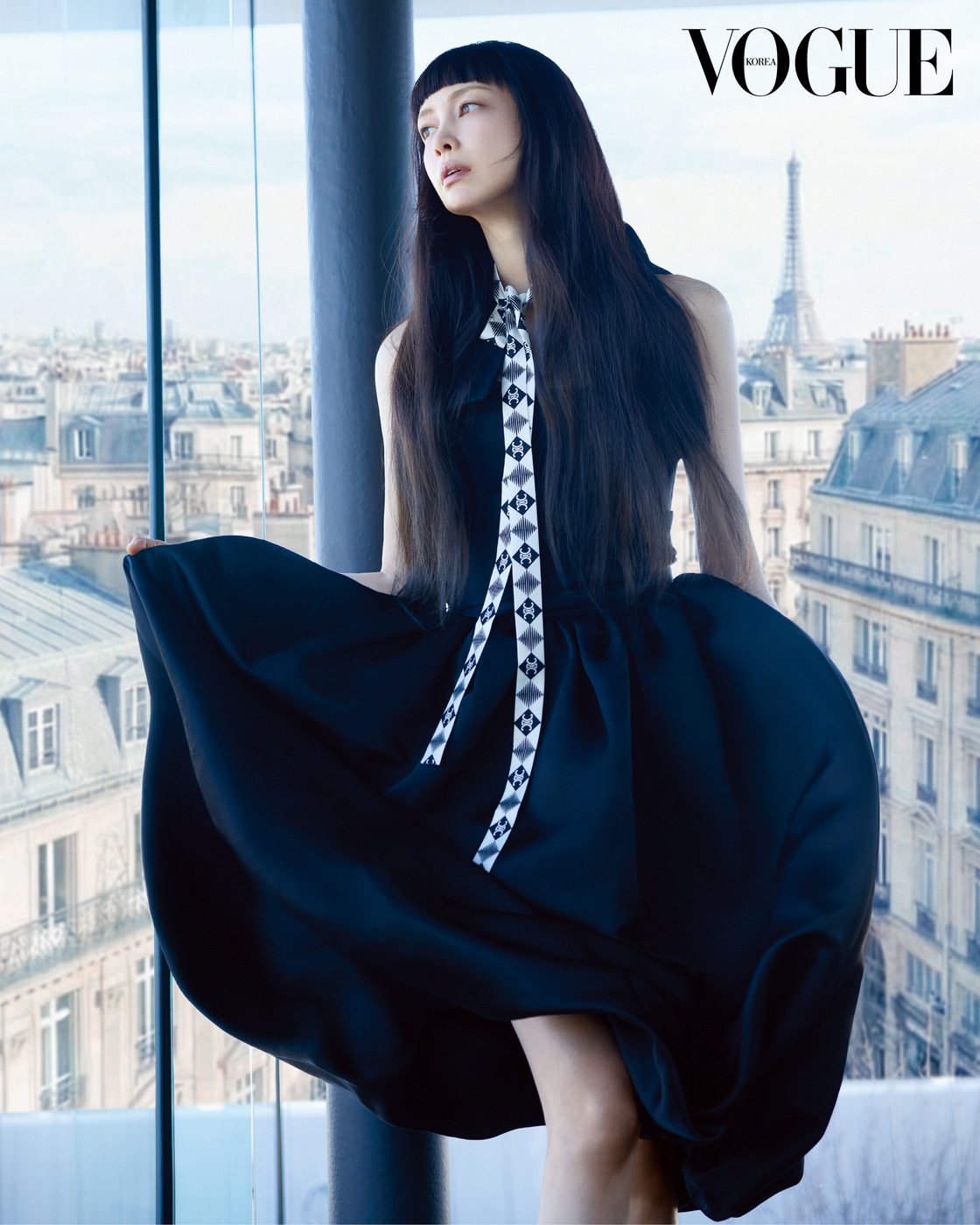 세련되고 쿨한 파리지엔 무드 속에서 강렬한 매력을 발산한 다홍색. 와이드 팬츠로 완성한 저지 소재 올인원 수트와 케이프는 멋스러움 그 자체. 배우의 독특한 매력과 잘 어울린다.