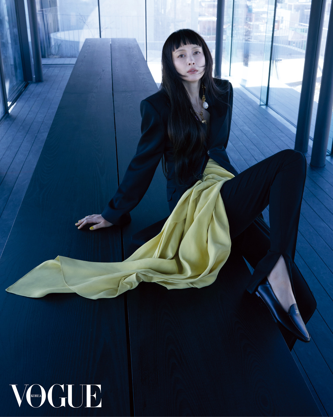 블랙 테일러드 재킷과 팬츠에는 순간의 유행이 아니라 시간이 지나도 삶과 함께 남는 옷이라는 철학이 강하게 반영되었다. 드레이프 미니스커트를 매치해 트렌디한 감각도 드러낸 블랙 수트와 검정 로퍼.