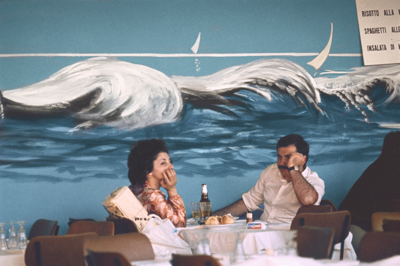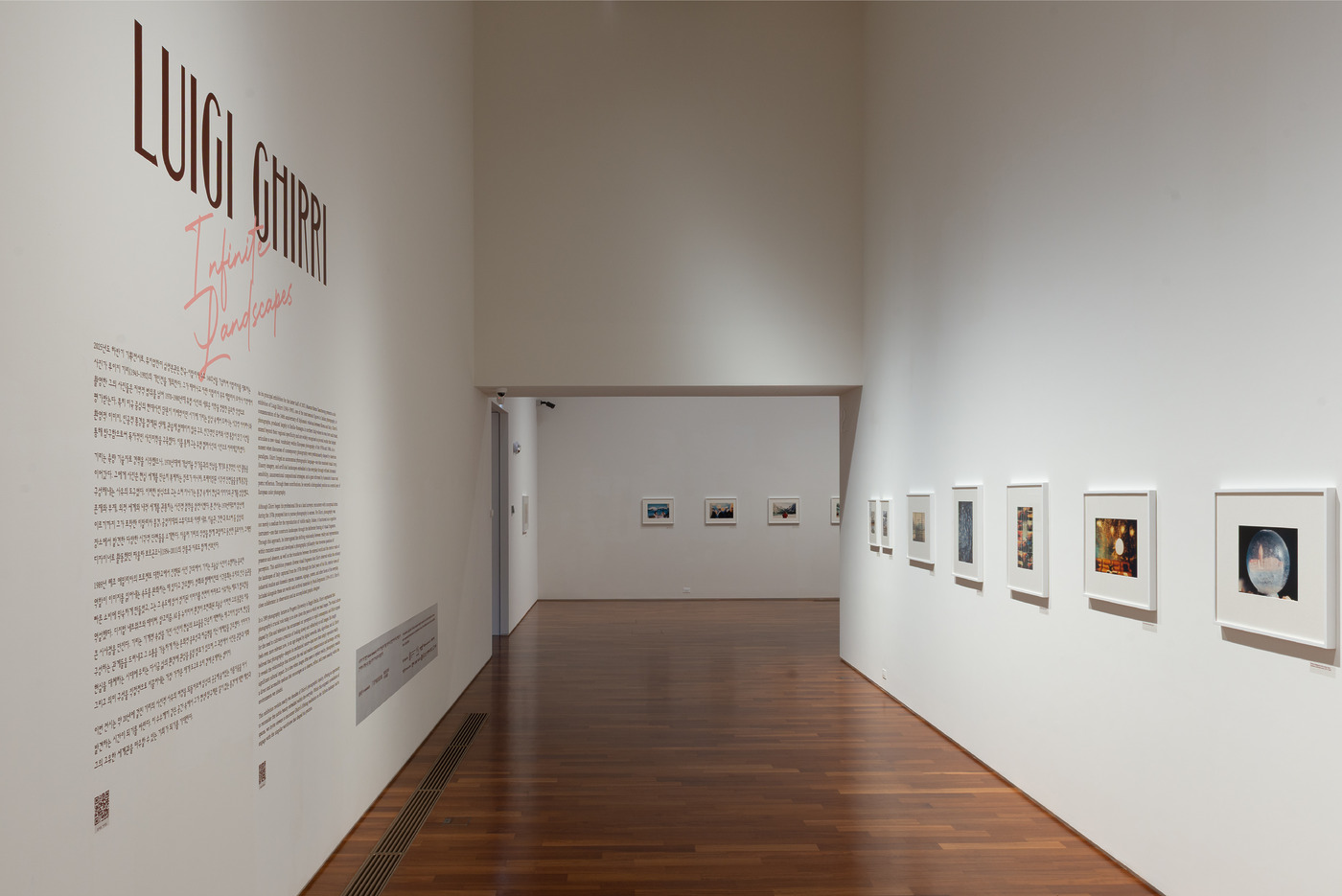 1970년대부터 말년까지 루이지 기리가 포착해온 다채로운 풍경은 추운 겨울의 한기마저 거둡니다. 이탈리아의 일상 풍경, 공업지대의 스튜디오와 자택 내부, 미술관, 간판과 포스터 등 익숙한 공간에서 포착한 평범한 장면들이 유난히 신선하고 따스하게 다가옵니다. 아마도 그의 사진이 특유의 정제된 색채, 자유로운 구도, 인간적인 유머를 두루 품고 있기 때문일 겁니다. 저는 특히 ‘Grostè Refuge’라는 사진이 마음에 들었는데요. 하얗게 성에 낀 창문 너머 펼쳐지는 설산의 환영 같은 풍경이 시각뿐만 아니라 촉각까지 자극하더군요. 온 가족이 그림 앞에 서 있는 뒷모습은 또 어떤가요. 고전영화의 한 장면 같은 그들의 뒷모습처럼, 지금 나의 뒷모습도 일상의 역사를 기억하게 하는 장치가 되지 않을까, 상상해보았습니다.