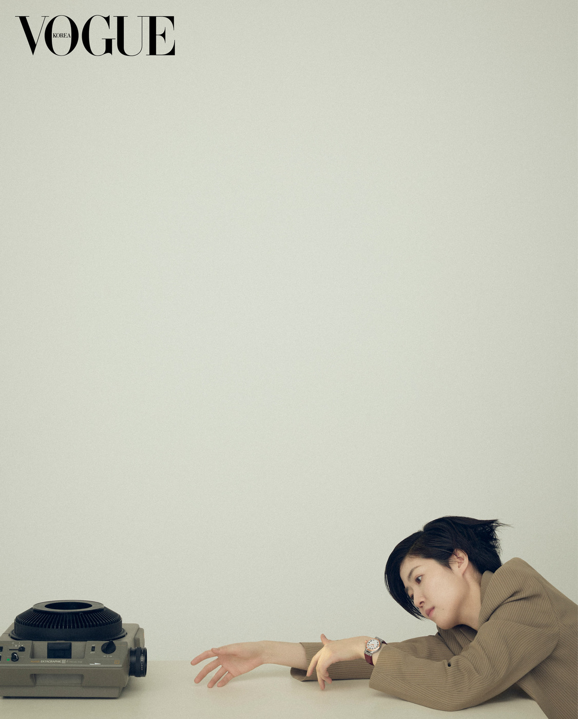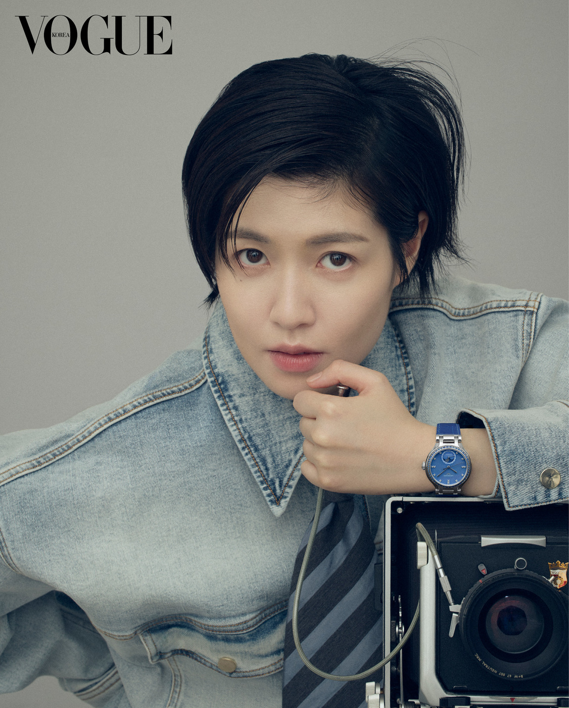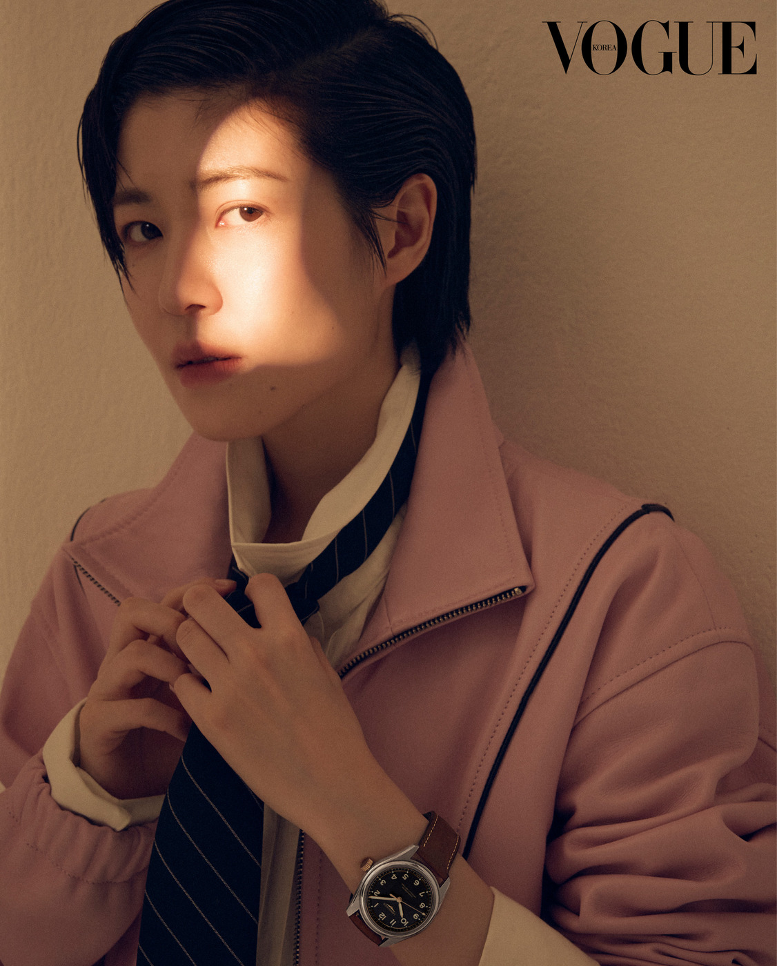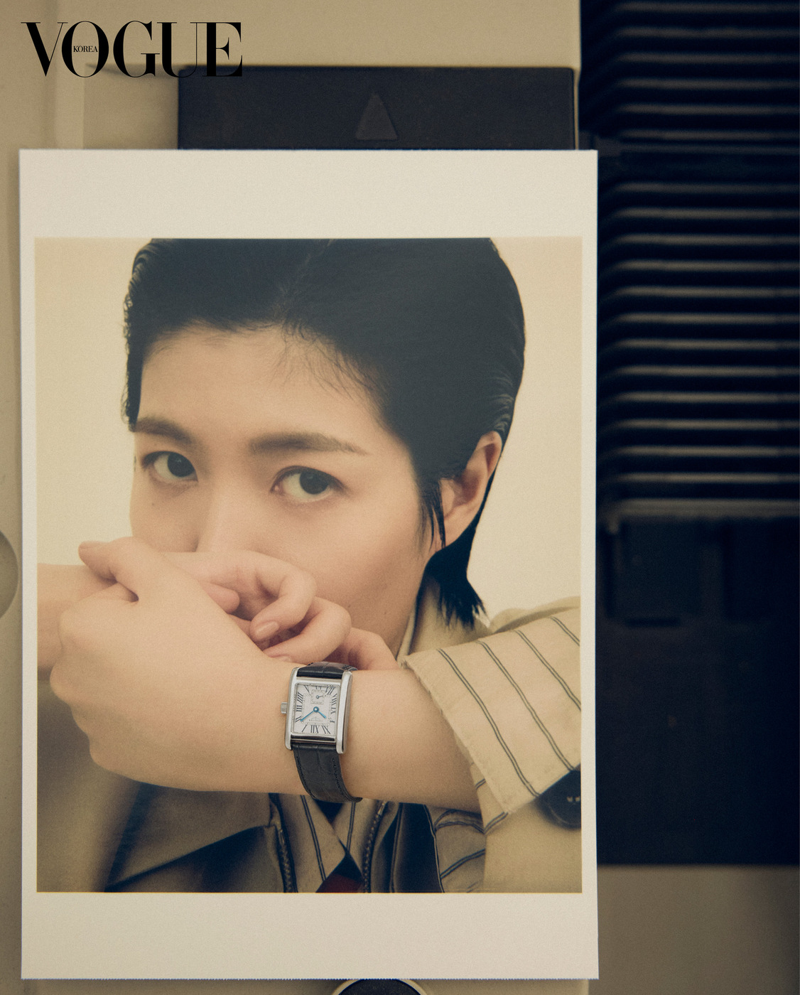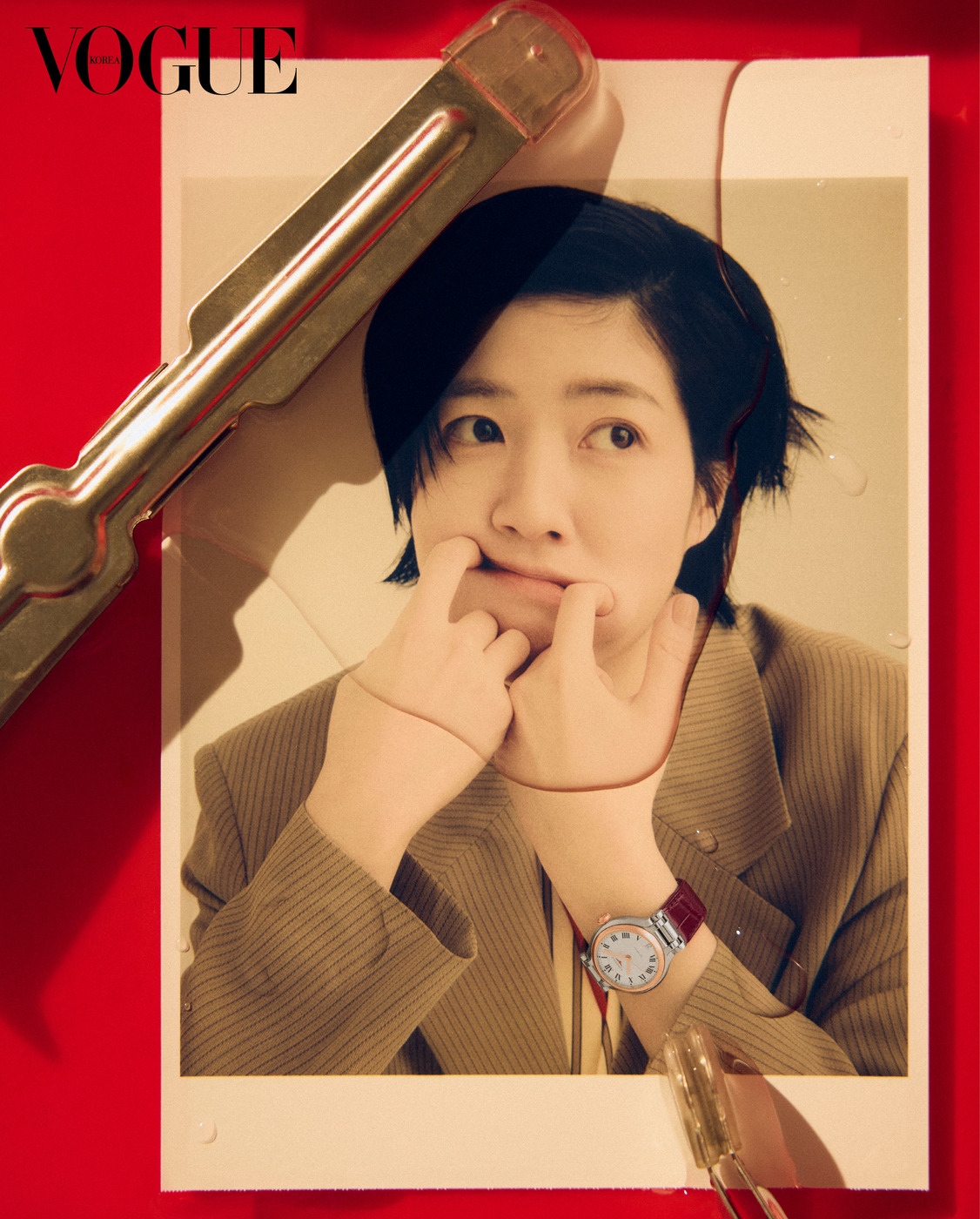 The Actress 심은경은 카메라 앞에서 가장 자유롭다. 로즈 골드 캡을 얹은 34mm 스틸 케이스에 와인색 악어가죽 스트랩을 조합한 ‘프리마루나’ 시계를 착용한 그녀가 다양한 표정을 지어 보였다. 재킷은 골든구스(Golden Goose). 줄무늬 조끼는 막스마라(Max Mara).