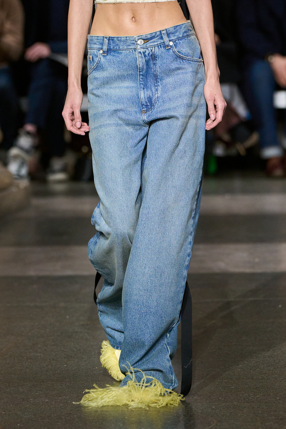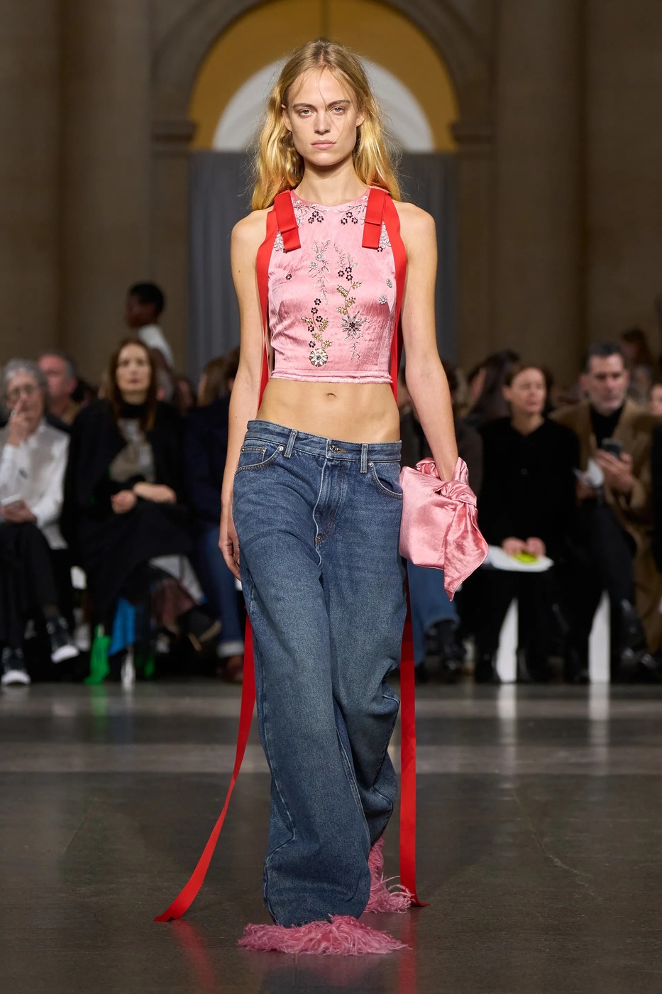 특히 은은하게 워싱 처리된 배기 핏 블루 진은 컬렉션에 신선한 바람을 불어넣었죠. 에르뎀 모랄리오글루의 컬렉션에서는 보기 드문 아이템이라 더 탐이 나기도 했고요. 비즈 장식으로 꾸민 사랑스러운 실크 톱에 헐렁한 청바지와의 조합, 에르뎀의 새로운 로맨틱이 될까요? 이날 어떤 룩보다 사랑스러웠습니다.