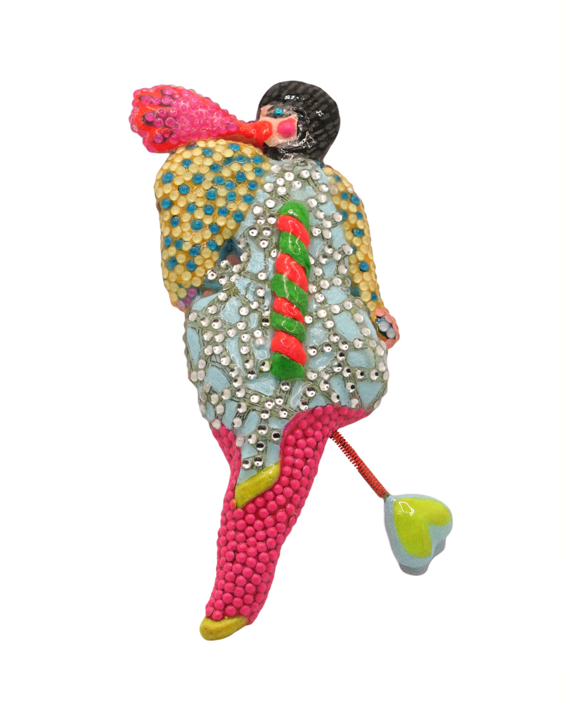 ‘그림자 꼭두’는 점토, 비즈, 컬러 철사, 실, 래커, 스와로브스키 스톤을 사용해 모든 과정이 수작업으로 이뤄진 작은 직립 인물 형상이다. 먼저 철사와 실로 뼈대를 구성한 뒤, 점토를 입혀 신체와 구조를 형성한다. 이후 색채와 비즈 장식, 드로잉을 표면에 중첩해 반사와 장식이 응축된 지점을 만들어낸다. 이 시리즈는 삶과 죽음의 경계에서 영혼을 인도하고 보호하는 한국 전통 장례의 꼭두를 재해석했다. 그림자 같은 부적으로 형상화된 작품은 개성과 차이, 온기와 유머를 포용하며, 상실의 감정을 돌봄의 촉각적 언어로 승화한다.