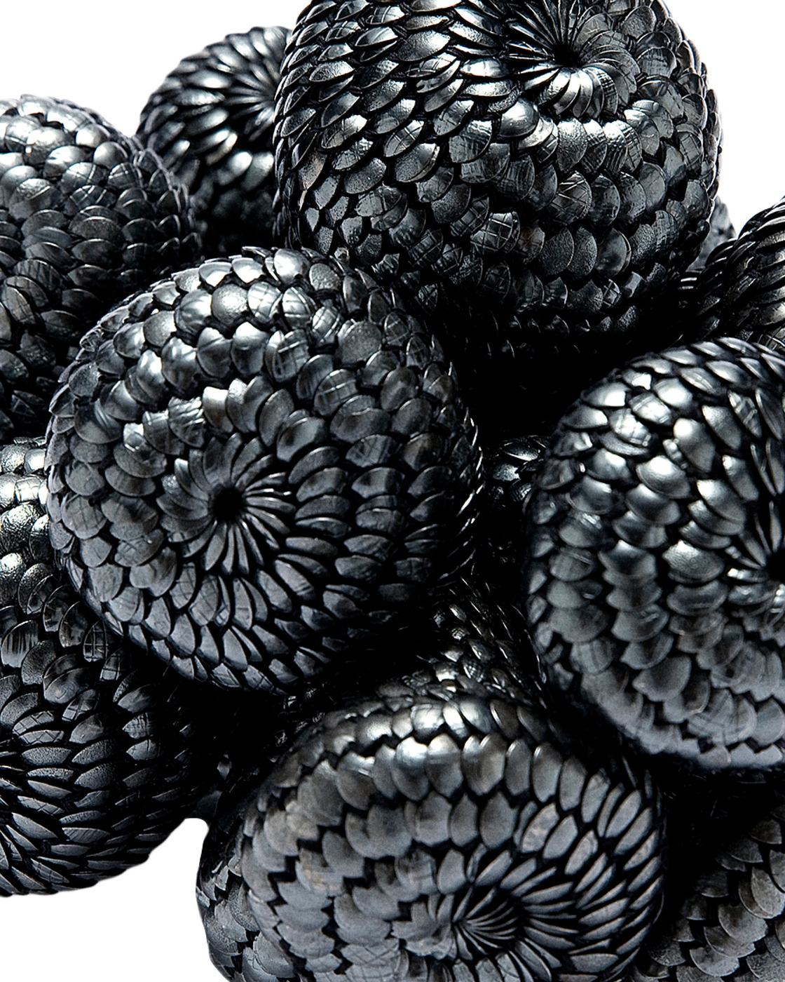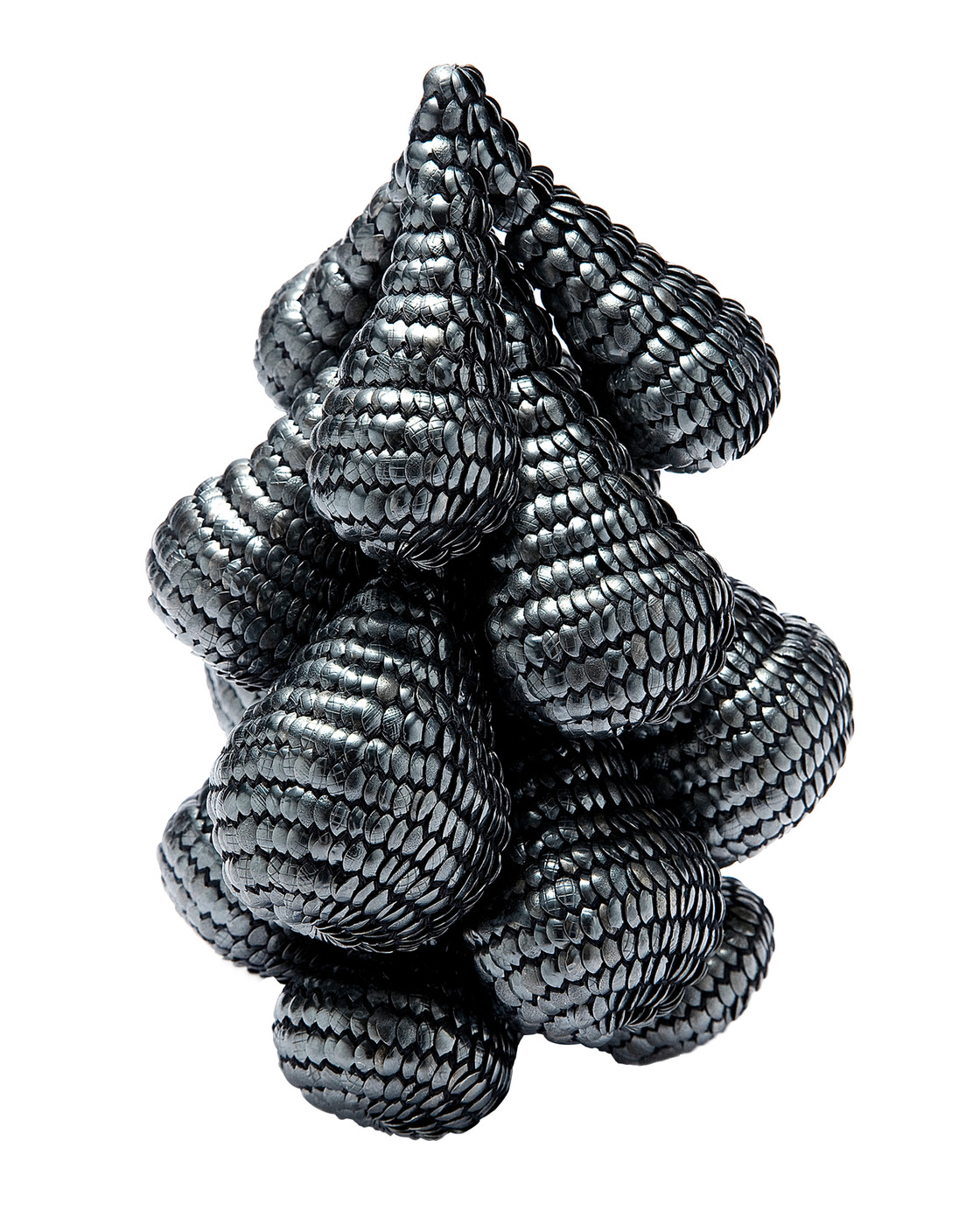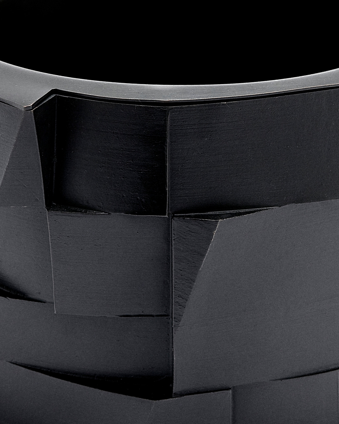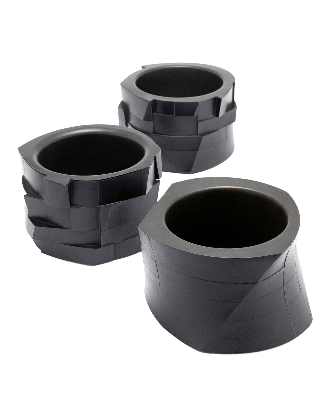 로에베 재단 공예상에 출품한 브론즈 연작 3점은 서로 다른 두 몰드 세트의 요소를 조합해 탄생했다. 이를 통해 더 복합적이고 역동적인 형태를 구현하며, 각 작품은 미묘한 변주와 시간의 깊이를 머금는다. 형상 내부에는 성형된 구리 내벽을 삽입해 이중 레이어 구조를 만들었고, 표면은 화학적 산화 처리를 거쳐 빛에 따라 변화하는 깊은 블랙의 파티나를 입었다. 이 과정은 관람자, 사물, 시간 사이의 지속적인 관계를 통해 지각을 형성해나가는 조각적 실험이다.