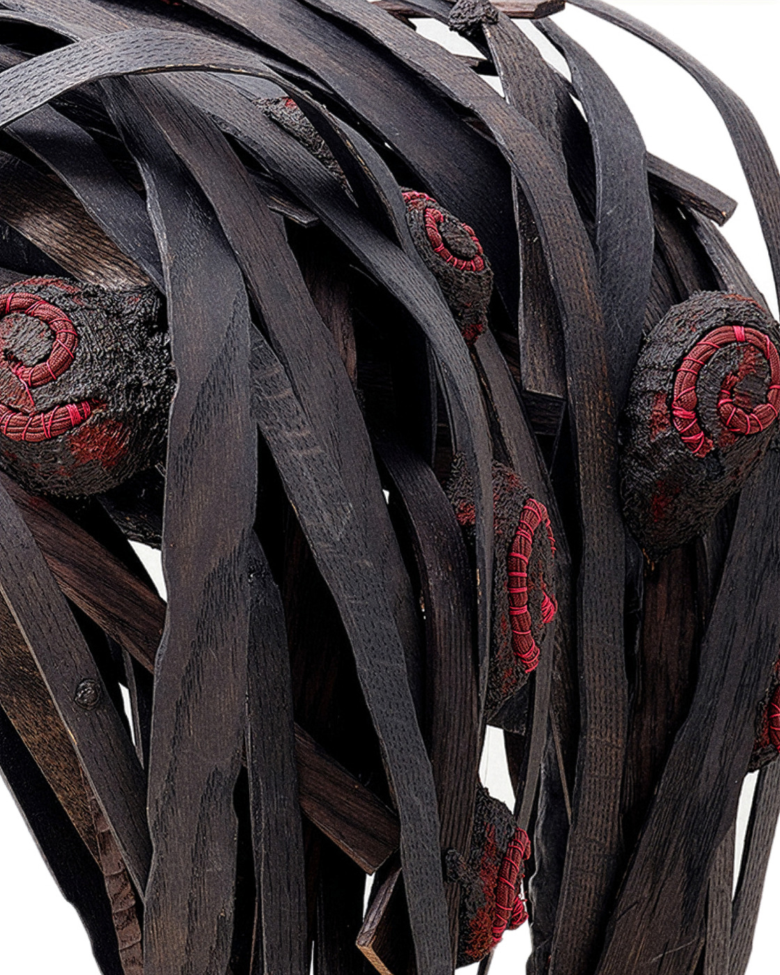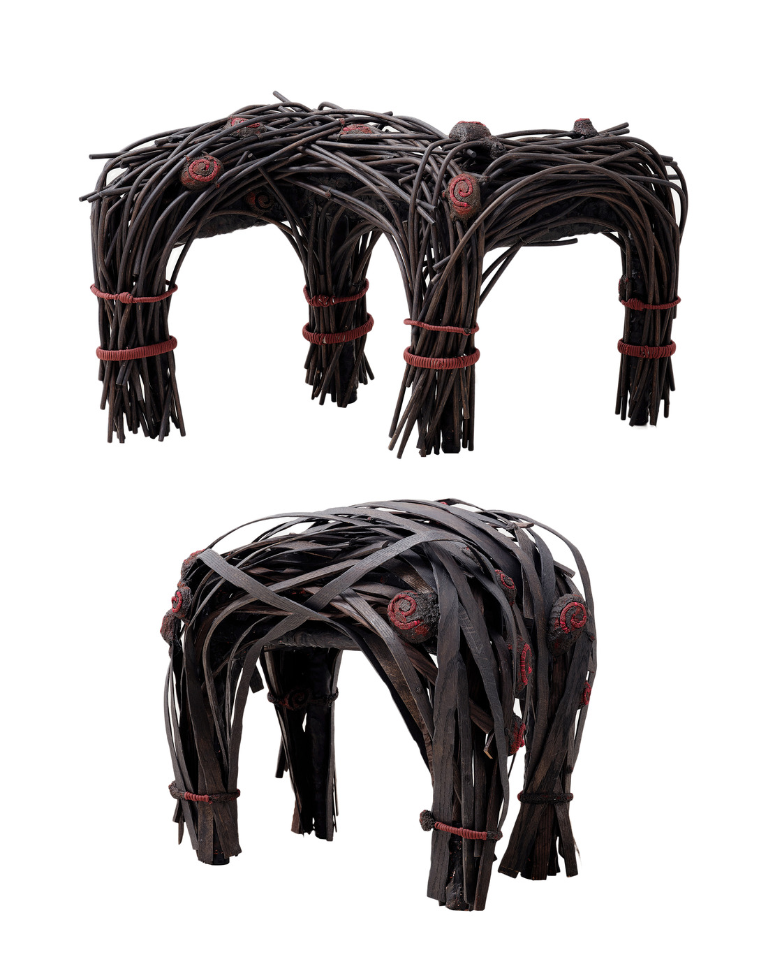 로에베 재단 공예상에는 가늘고 긴 오크 조각을 서서히 구부리고, 엮고, 묶는 과정을 통해 완성된 두 점의 네 다리 형상 연작을 출품했다. 고온의 증기로 구부려 탄성과 긴장을 부여받은 조각은 작가의 손을 통해 결합되며, 그 과정은 저항과 유연성 사이에서 이루어지는 물리적 협상의 결과다. 황토와 끈이 더해져 표면과 구조 사이 상호작용을 이루고, 전체 형태는 새들이 나뭇가지를 모아 둥지를 짓는 건축적 방식을 떠올린다. 재료가 쌓이고 서로 결속되는 과정에서 삶의 구조를 은유적으로 재구성하며, 서로 기대고 포개며 형성되는 집단적 지지가 결국 강인함과 안정성으로 이어짐을 보여준다.
