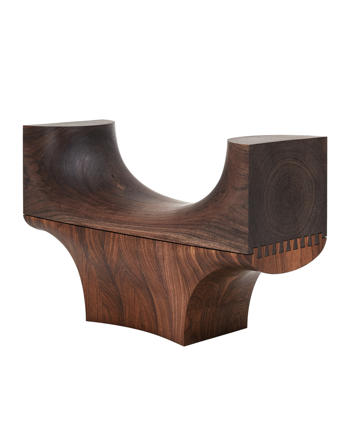 작품 ‘배흘림’은 두 개의 호두나무 덩어리로 구성된 조각적 벤치. 상부는 단일 블록을 깎아 축적된 나이테와 질감을 드러내고, 하부는 수직 결을 세워 구조적 방향성을 강조했다. 전기톱으로 거칠게 형태를 잡고 주먹장이음으로 결합한 후 그라인더와 대패로 다듬은 목재는 시간의 흐름에 따라 함께 팽창하고 수축하며 하나의 몸체로 안착되고, 불안정해 보일 수 있는 형태에서 시각적 균형을 형성한다. 위에서 내려다볼 때 이런 형태를 연상시키는 부드러운 실루엣은 한국 전통 건축 기둥의 미세한 부풂을 의미하는 배흘림에서 영감을 받았으며, 흐르는 나뭇결과 곡선을 통해 신체와 공간을 유기적으로 연결한다.