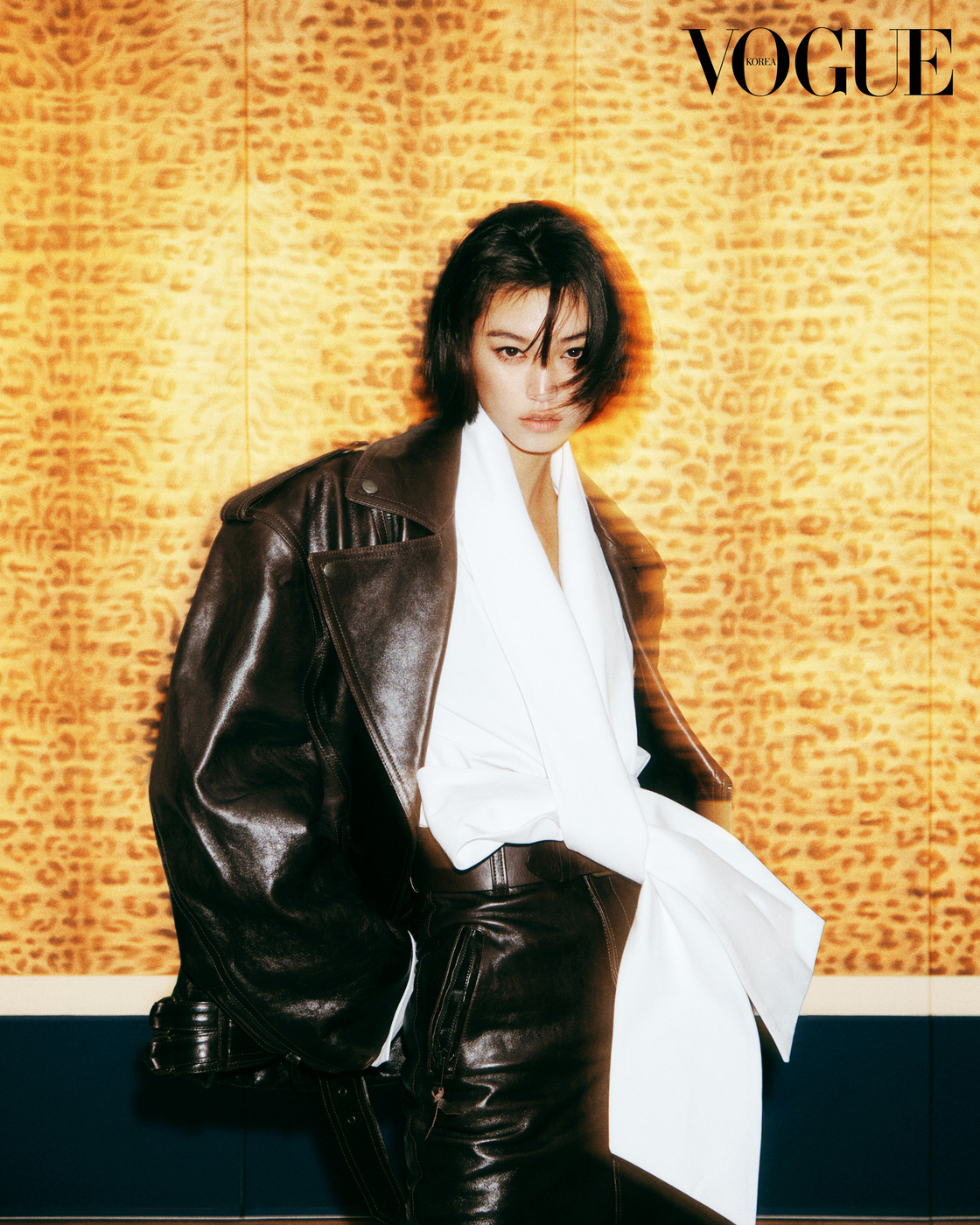 Shades of Her 빳빳한 화이트 셔츠와 넓은 어깨의 가죽 재킷, 스커트가 함께하는 생 로랑 스타일. 김지평, ‘더블스크린’, 2025, 2폭 가리개 병풍: 한지에 장황 재료(비단띠, 비단, 색한지) 콜라주, 144×104cm