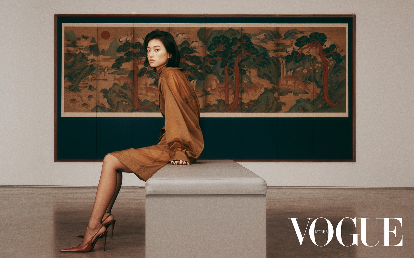 Flower Woman 바카렐로가 그리는 여성상의 두 번째 챕터는 얇은 필름 같은 컬러풀한 나일론 블라우스와 펜슬 스커트, 트렌치 코트. 머스터드 컬러 블라우스와 스커트를 마무리하는 건 뾰족한 슬링백 구두. ‘십장생도(十長生圖)’, 19세기, 비단에 채색, 201×406.5cm