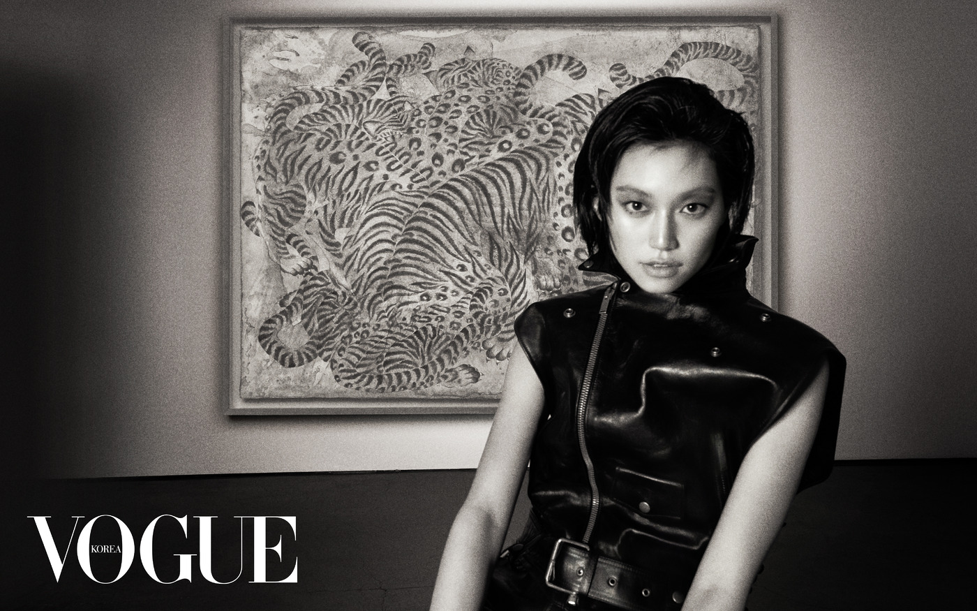 Lasting Look 생 로랑 여성의 이미지를 지닌 김도연. 호랑이를 그린 민화를 재해석한 김지평 작가의 그림과 잘 어울린다. 김지평, ‘범의 머리를 담그면 비가 내린다’, 2013, 옻칠, 한지에 먹, 호분, 100×155cm
