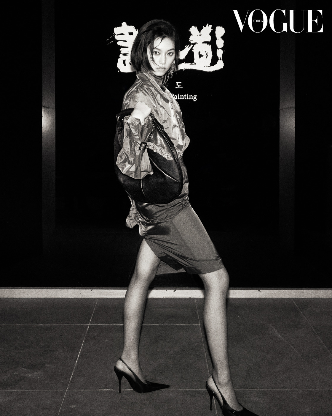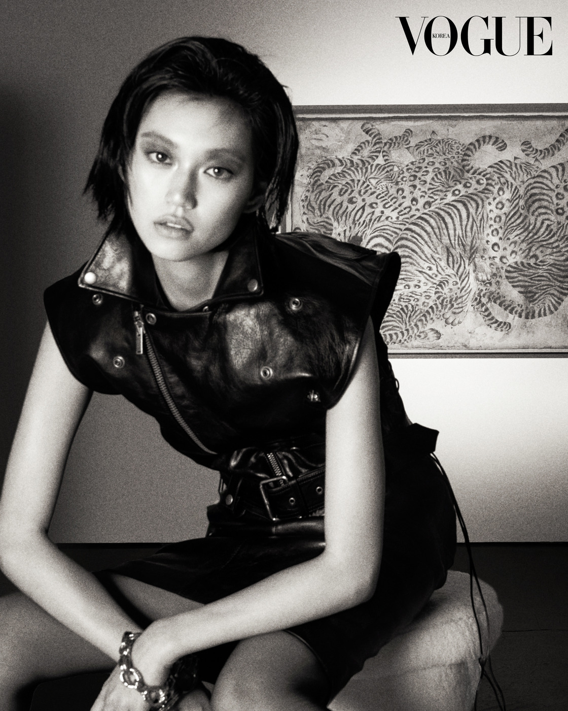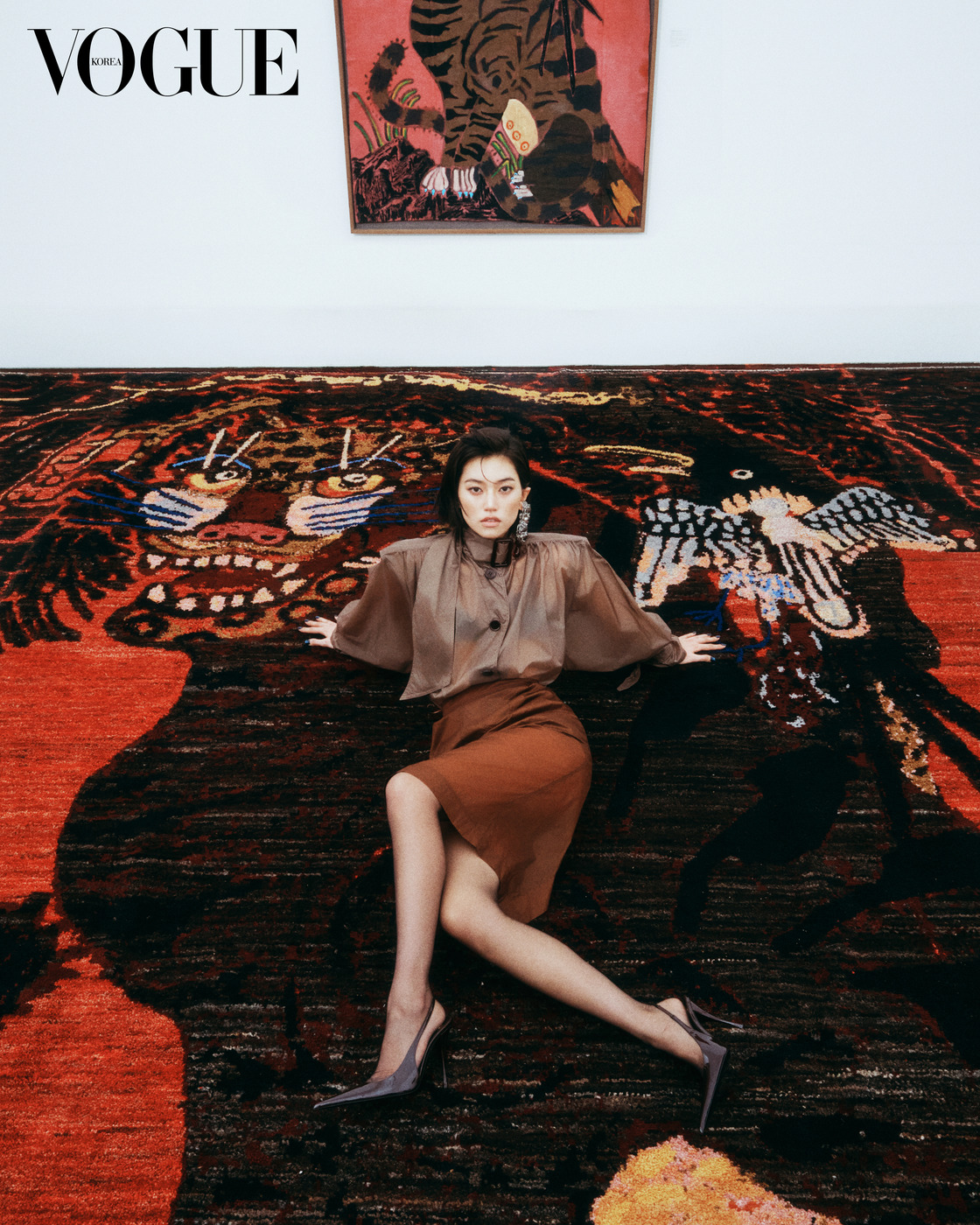 Her Gaze “수상한 귀족(Louche Aristocrat).” 생 로랑(Saint Laurent)의 아티스틱 디렉터 안토니 바카렐로(Anthony Vaccarello)는 올봄 자신의 여성을 이렇게 정의 내렸다. 로버트 메이플소프 사진에서 볼 듯한 터프한 가죽 재킷과 스커트 스타일이 이번 컬렉션의 시작이다. 김도연이 생 로랑의 여인이 되어 카메라를 응시한다. 김지평, ‘범의 머리를 담그면 비가 내린다’, 2013, 옻칠, 한지에 먹, 호분, 100×155cm
