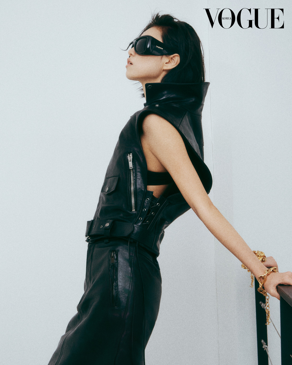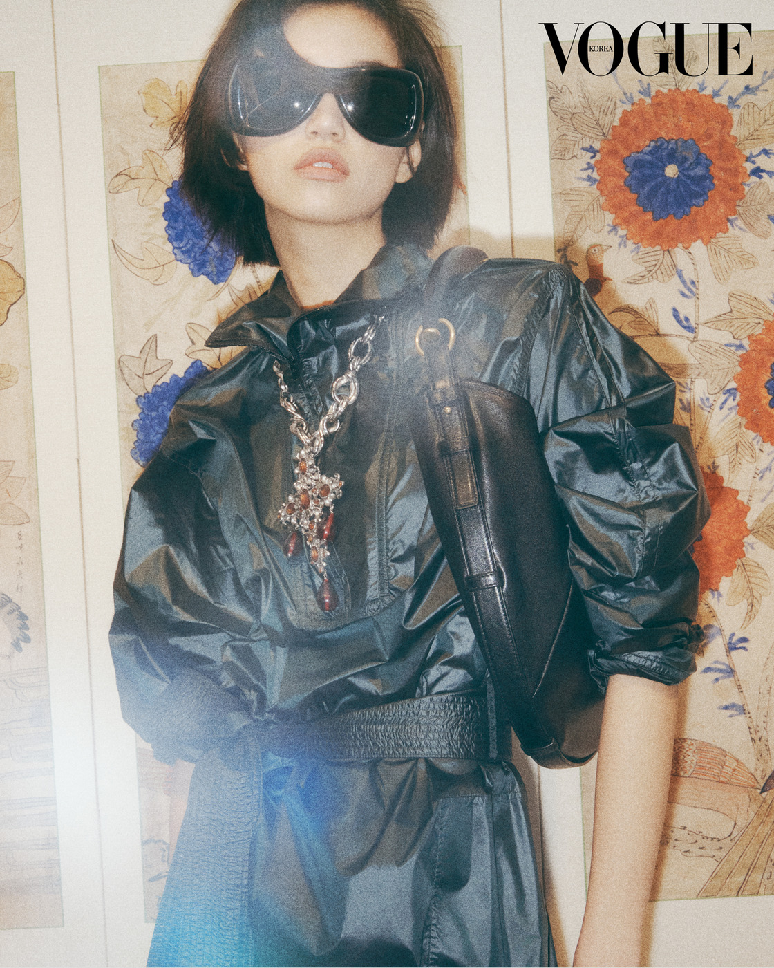 On the Rail 센강을 거니는 의문의 여인을 그려낸 가죽 베스트 재킷과 스커트. 여기에 빅 사이즈 선글라스를 더했다. 한국 민화와 그를 바탕으로 새로운 민화 풍경을 만들어가는 작가를 모은 갤러리현대의 전시장에서 만났다.