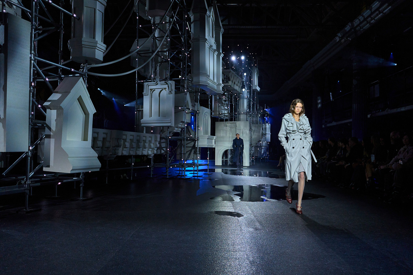다니엘 리는 버버리의 2026 가을/겨울 컬렉션을 런던 한복판에 있는 옛 어시장, 올드 빌링스게이트에서 공개했습니다. 철저히 런던다운 공간에서 다니엘은 어두운 아스팔트와 실제보다 더 실제 같은 물웅덩이를 배경으로 런던의 상징, 타워 브리지를 재현했습니다.