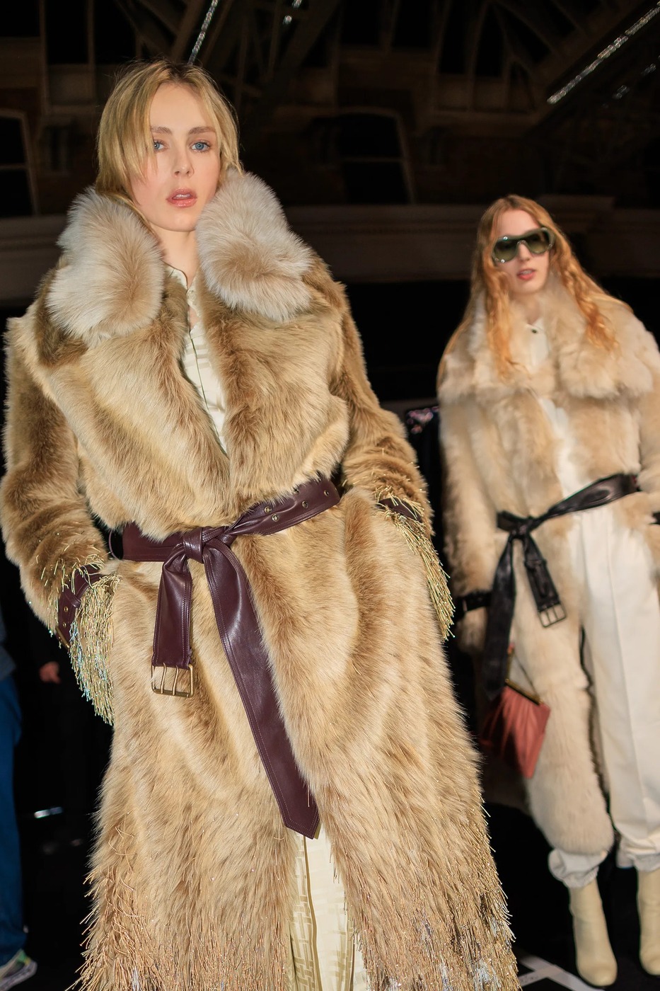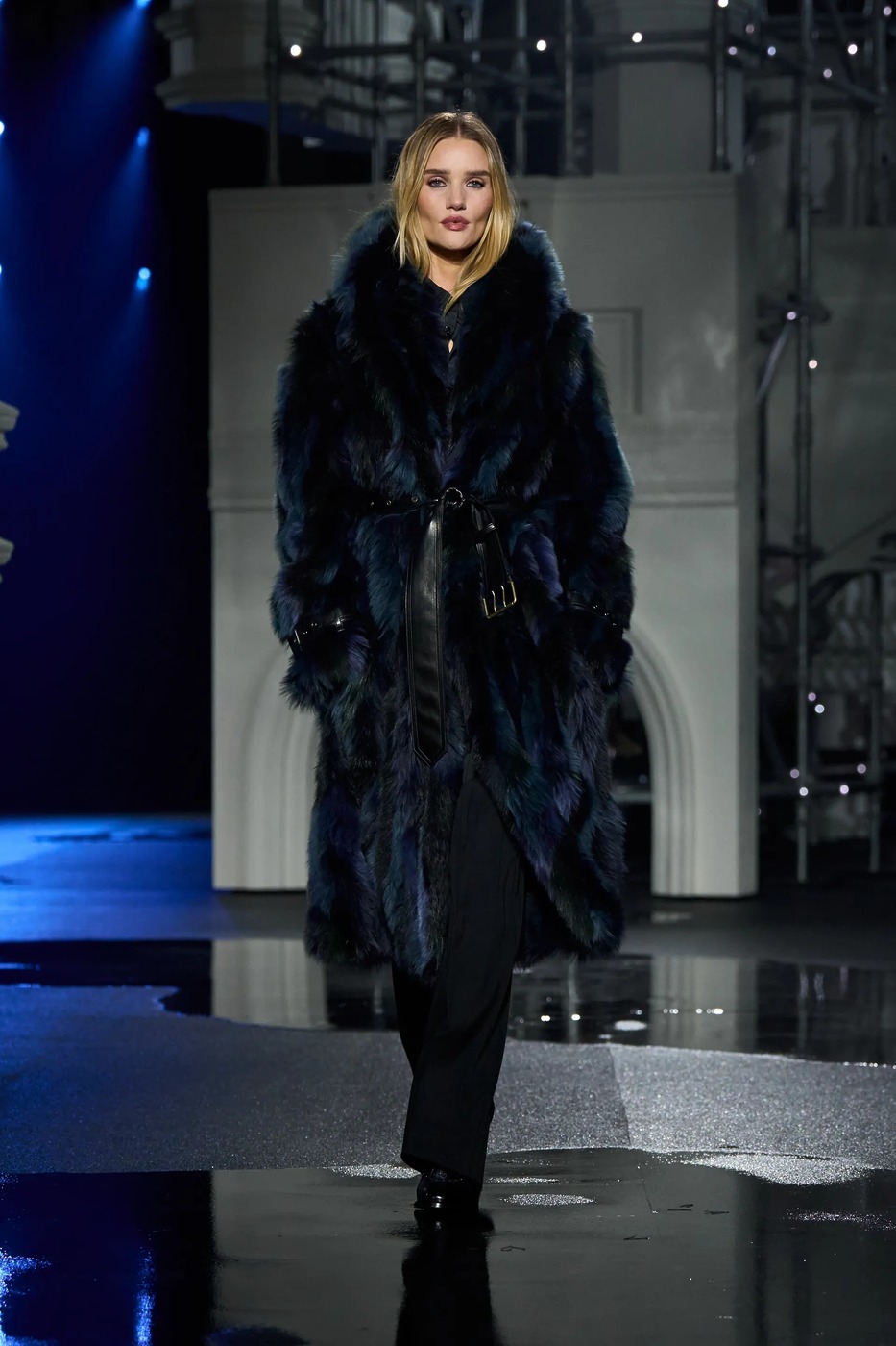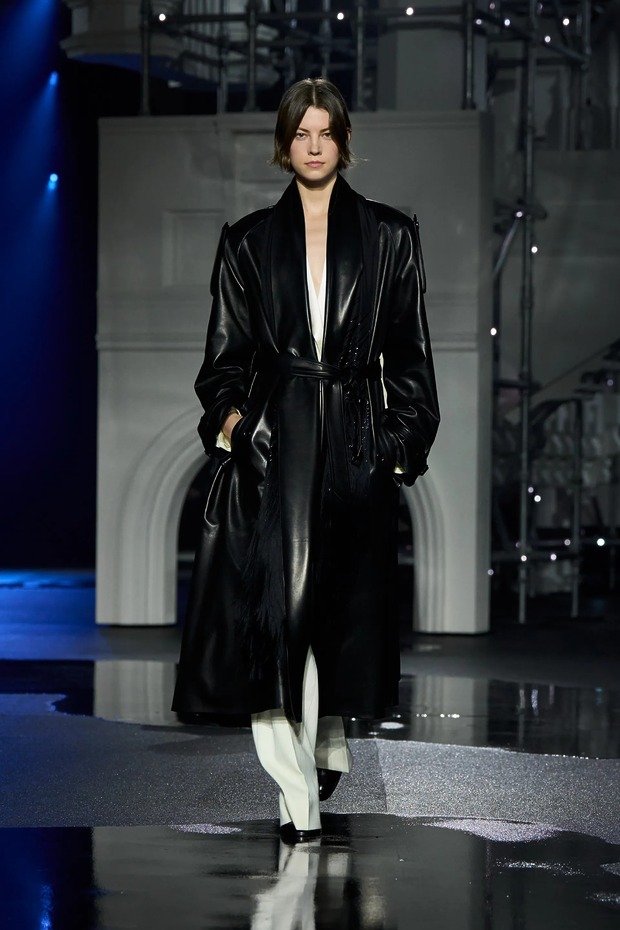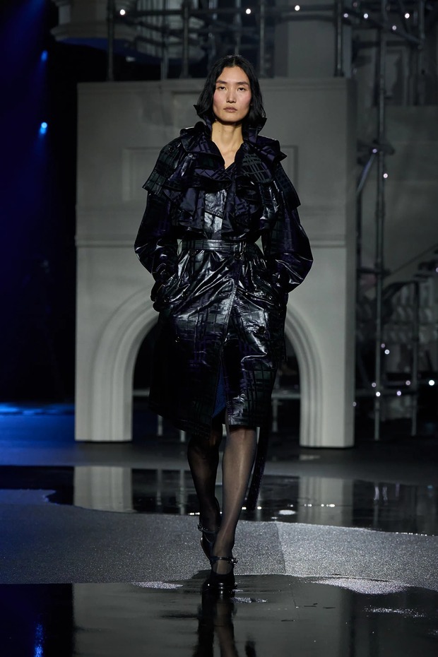 트렌치 코트는 한층 더 페미닌해지며 다양한 형태로 변주되었습니다. 버버리의 시그니처 패턴을 은은하게 두른 클래식한 버전부터 러플 칼라와 광택 있는 기능성 소재로 완성한 드레시한 버전, 벨트로 허리를 졸라맨 인조 모피까지 다채로운 스타일을 만날 수 있었죠. 레더는 팬츠와 수트를 지배했고, 프린지는 전체적인 실루엣에 생동감을 더했고요. 아카이브의 런던 지도가 그려진 아노락이 컬렉션 하이라이트로 시선을 끌었습니다.