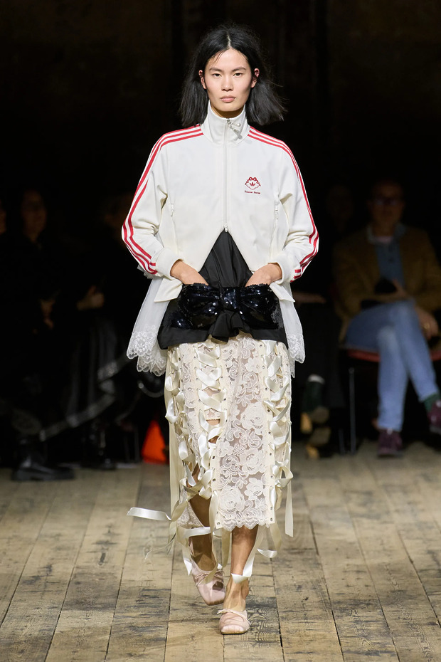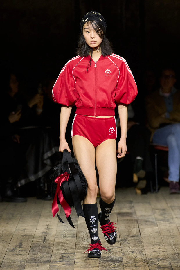 지난 22일 시몬 로샤가 런던 외곽에 위치한 알렉산드라 궁(각종 스포츠 경기가 열리는 장소입니다)에서 2026 가을/겨울 컬렉션을 선보였습니다. 컬렉션에서 가장 눈에 띈 것은 평소 시몬 로샤 런웨이에서 찾아볼 수 없던 트랙 톱, 트랙 쇼츠, ‘짐 백’ 같은 스포츠웨어의 재해석이었습니다. 전부 아디다스와 협업으로 완성된 아이템이죠. 시몬 로샤는 아디다스의 상징 같은 ‘삼선 재킷’의 단추에 진주 장식을 더하고 소매를 부풀렸습니다. 소재를 달리하고 쇼츠나 프릴 장식을 더한 롱 슬리브 역시 ‘스포티’와 ‘페미닌’이 완벽하게 공존하는 모습이었어요.