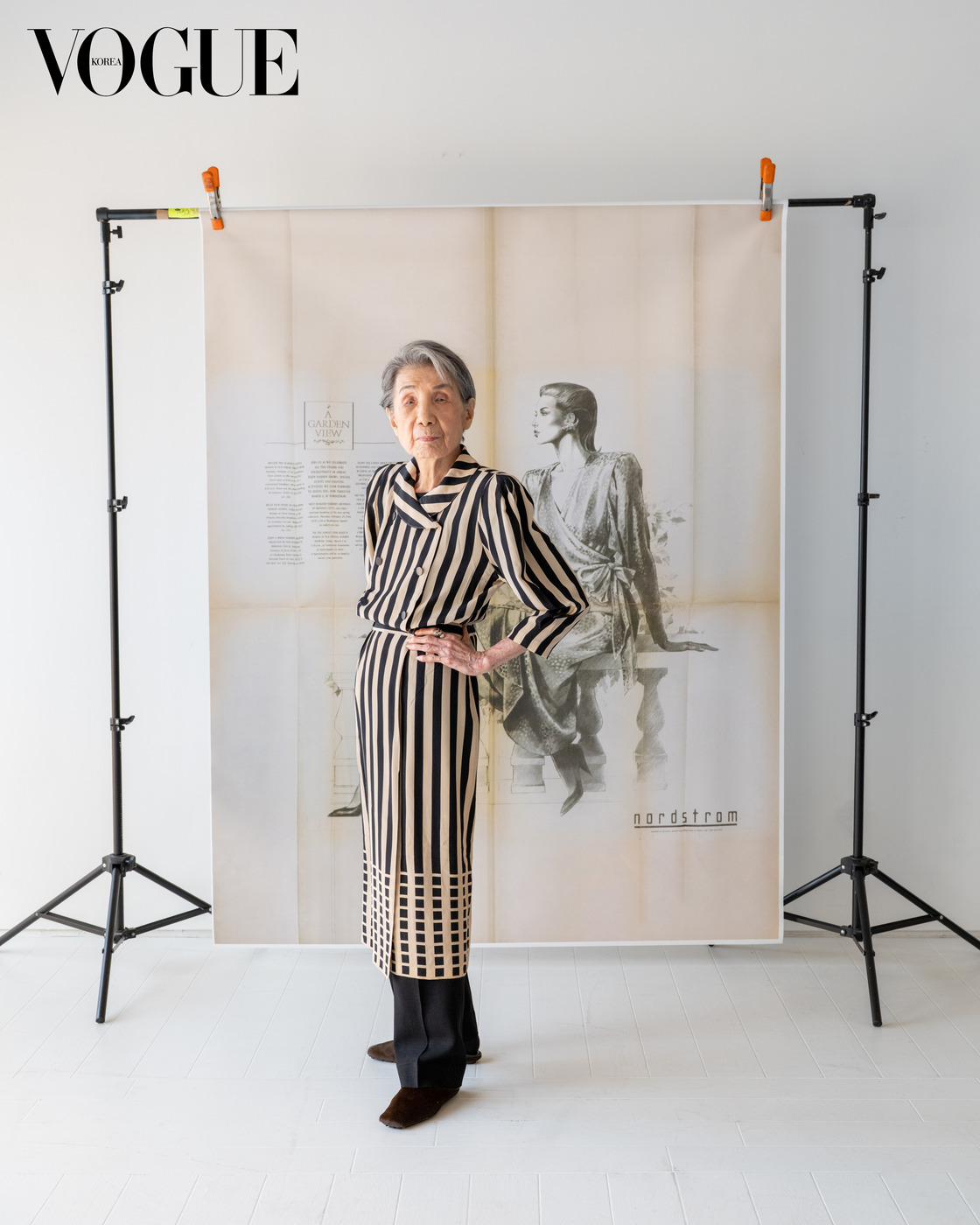 1950~1960년대 양장 시대부터 1970년대 기성복 시대, 수입 브랜드가 국내에 쏟아져 들어온 1990년대, 2000년대 이후 K-패션이 글로벌 무대로 진출하기까지, 노라노와 진태옥은 패션 디자이너로서 서로 밀어주고 끌어주며 길고도 긴 길을 걸어왔다. 이들의 삶이 곧 한국 패션사와 다름없다. 노라노는 1956년 반도호텔(현 롯데호텔)에서 한국 최초의 패션쇼를 선보였고, 윤복희의 미니스커트와 펄 시스터즈의 나팔바지를 비롯해 1950~1960년대를 대표하는 거의 모든 연극, 영화, 쇼 의상을 디자인한 인물이다. 1970년대 후반 뉴욕에 진출한 사건은 그녀의 인생에서 ‘두 번째로 잘한 일’이었다. “첫 컬렉션에서 선보인 옷이 메이시스(Macy’s) 백화점의 15개 윈도에 쫙 깔렸죠. 한국에서 30년 동안 옷을 만들었으니 그 정도는 내가 열심히 해서 얻은 당연한 결과라고 생각했는데, 교만이었죠. 미국 출신 디자이너도 그렇게 윈도 전체를 차지한 적은 없었다고들 하니까.” 이번 <보그> 촬영을 위해 노라노가 꺼내 입은 독특한 스트라이프 패턴의 아이보리색 실크 드레스는(원래 바탕색은 흰색에 가까웠다) 프린트를 잘 맞춰 재단하고 봉제하여 스트라이프 라인을 매끄럽게 맞추고, 허리 뒤쪽에 고무줄을 넣어 편의성을 높인 섬세한 디자인으로 1984년 뉴욕 컬렉션에서 가장 뜨겁게 주목받은 아카이브 의상이다. “오늘 선생님께서 이 옷을 골라 입고 오신 걸 보고 ‘역시 고수’라고 느꼈어요. 다른 옷은 기억에 없는데, 저도 이 옷은 기억할 정도로 디자이너라면 모두가 감탄한 당대의 디자인이죠.” 진태옥이 연신 감탄했다.