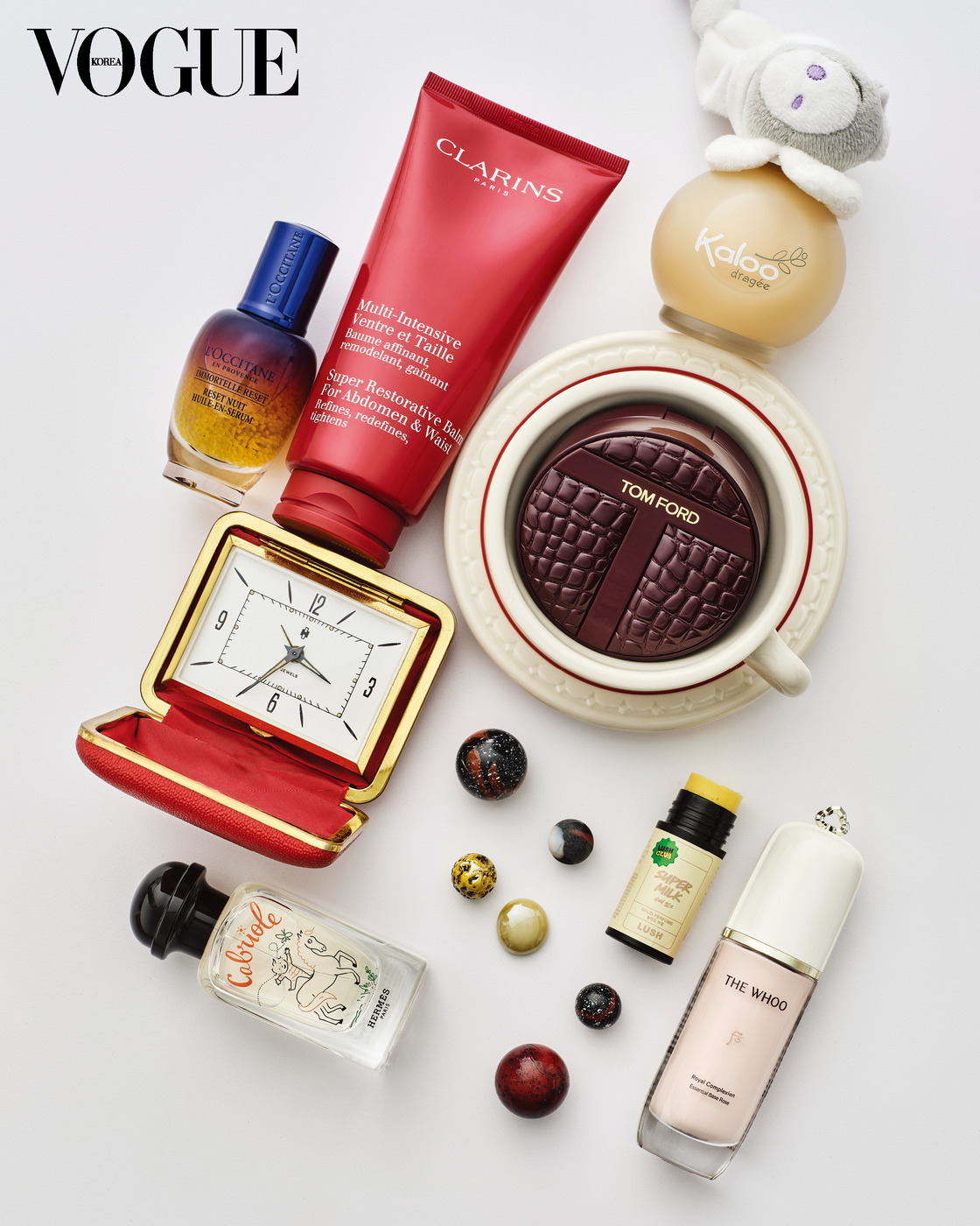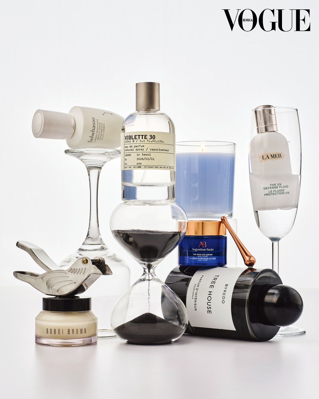 (왼쪽 위부터 시계 방향으로) SULWHASOO ‘Lumiwise Brightening Ampoule Serum’ 기미나 색소침착으로 칙칙해진 얼굴을 환하게 밝히는 설화수 ‘자정앰플세럼’. 피부 속부터 차오르는 투명한 광채를 더한다. LE LABO ‘Violette 30’ 섬세한 제비꽃 향을 담은 르 라보 ‘비올렛 30’. 맑고 순수한 향이 깊이 있는 우드로 변모하는 모습이 인생의 흐름과 닮았다. AUGUSTINUS BADER ‘The Rich Eye Cream’ 민감한 눈가를 보호하는 아우구스티누스 바더 ‘더 리치 아이 크림’. 스틸 애플리케이터로 마사지하면 생기를 되찾을 수 있다. LA MER ‘The UV Defense Fluid’ 실내보다는 야외 활동이 잦은 이들에게 필수인 라 메르 ‘유브이 디펜스 플루이드’. 로션처럼 산뜻하지만 자외선 차단 효과는 강력하다. BYREDO ‘Tree House Room Spray’ 집에서 보내는 시간을 풍요롭게 하는 바이레도 ‘트리 하우스 룸 스프레이’. 피톤치드가 풍기는 듯 나무 향이 생생하다. BOBBI BROWN ‘Vitamin Enriched Face Base’ 메이크업 밀착력을 높이는 바비 브라운 ‘비타민 인리치드 페이스 베이스’. 수분 가득한 텍스처가 빠르게 스며들어 각질을 잠재운다