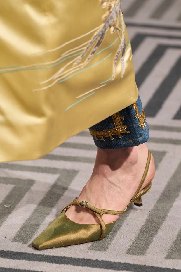 에르뎀은 이번 20주년 기념 쇼에서 로우 라이즈 배기 진을 재해석한 청바지를 선보였죠. 브랜드가 탄생한 2006년에 유행한 스타일이었고요. 코너 아이브스는 오프닝 룩으로 브로케이드 트리밍이 돋보이는 크롭트 진에 버클 슬링백을 매치했죠.