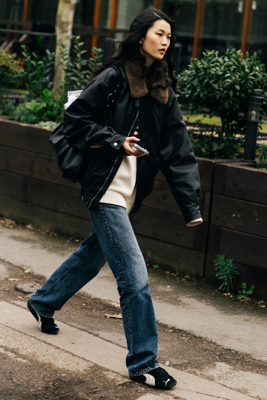 털어놓자면, 제게 턴업은 다리가 짧아 보일까 봐 피하는 청바지 1순위입니다. 그럴 때는 이런 포인트를 활용하세요. 상체와 신발에 주목하도록 시선을 분산하는 거죠. 특히 긴 트렌치 코트를 매치하면 바지의 시작을 가늠할 수 없고, 코트 길이만큼 다리도 길어 보일 확률이 높아지죠. 다리 길이에 구애받지 않는다면 사진처럼 봄버나 요즘 유행하는 미디 길이의 예쁜 아우터를 매치해보세요!